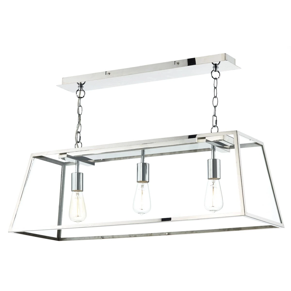 The ACADEMY 3lt bar pendant has a stainless steel ceiling plate and frame with clear glass panels. Perfect for use over kitchen islands or dining room tables and looks especially good when used in conjunction with vintage style lamps, available to buy separately.