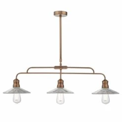 The ADELINE bar pendant has brushed copper metal work and a pressed glass shade, to look like it has come straight from a quaint French farmhouse kitchen. This three-light bar pendant is equally at home over a dining table or breakfast bar. Complete the look by pairing with our RUSTIKA or GLOBE LED filament lamps. With a telescopic rod, this pendant is adjustable on installation.