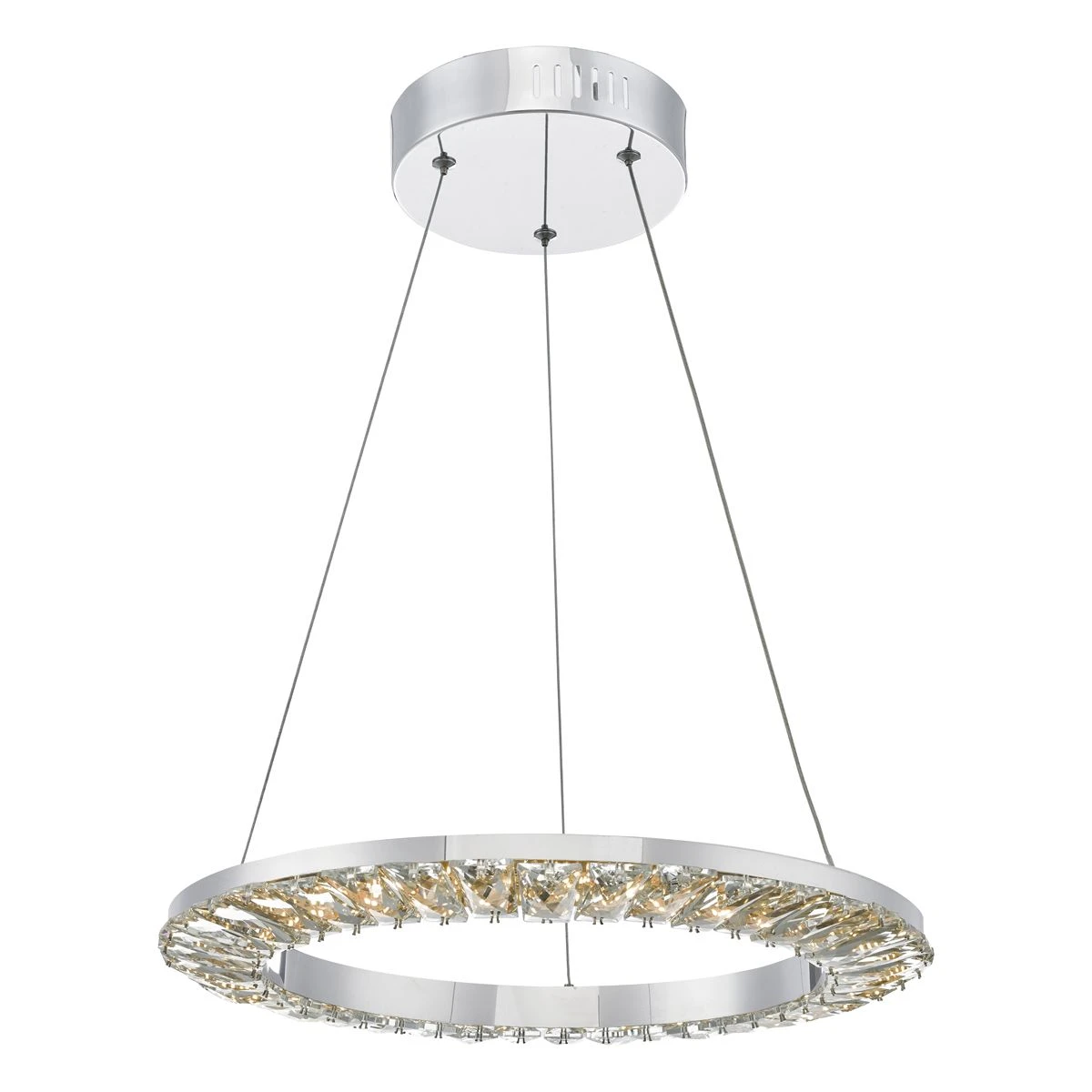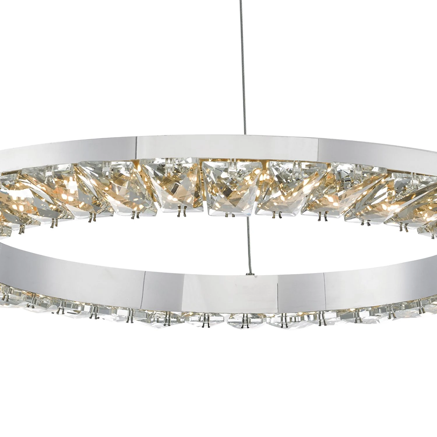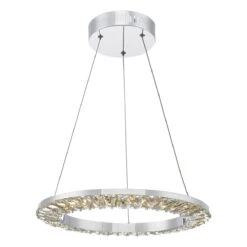 A contemporary ring of faceted crystals lit by efficient LEDs which can be dimmed using a suitable dimmer. Available as a flush or pendant fitting, this simple design brings out the clarity and beauty of its large crystal pieces.