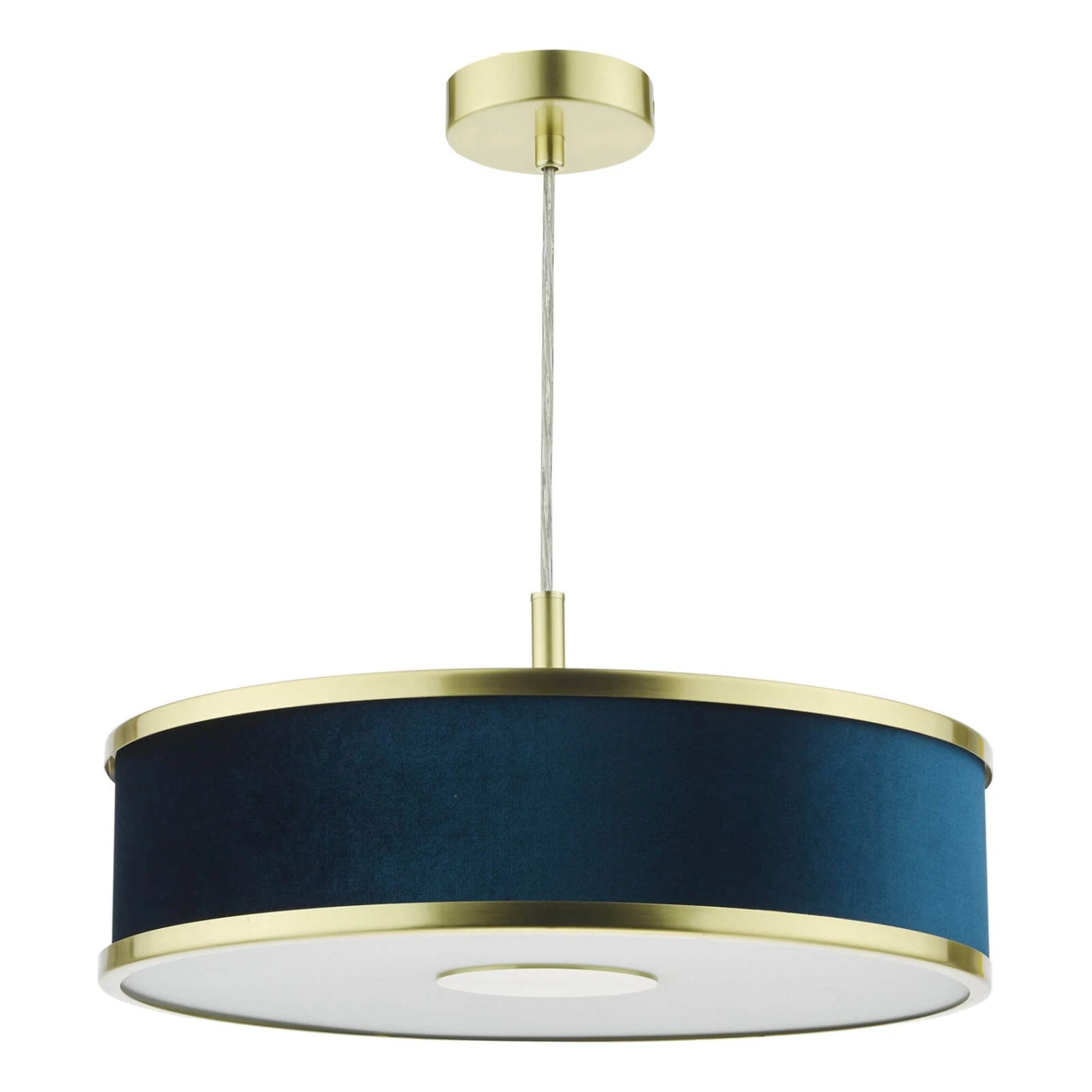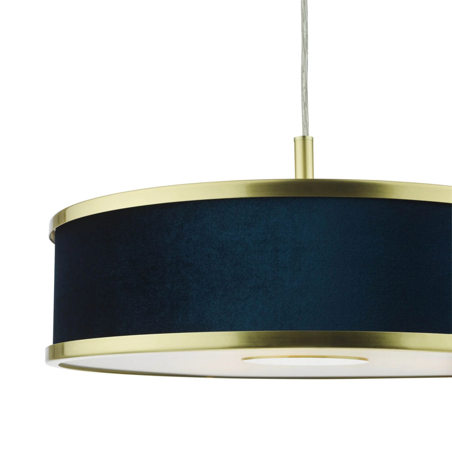Illuminate your space with this contemporary stunner. The Alvaro 3 Light Pendant features a brushed brass frame and frosted acrylic diffusers that emit a warm glow. Velvet shades in rich navy blue add a touch of drama and texture. The Alvaro allows you to set the perfect mood, whether it’s a cosy evening at home or an elegant dinner party.