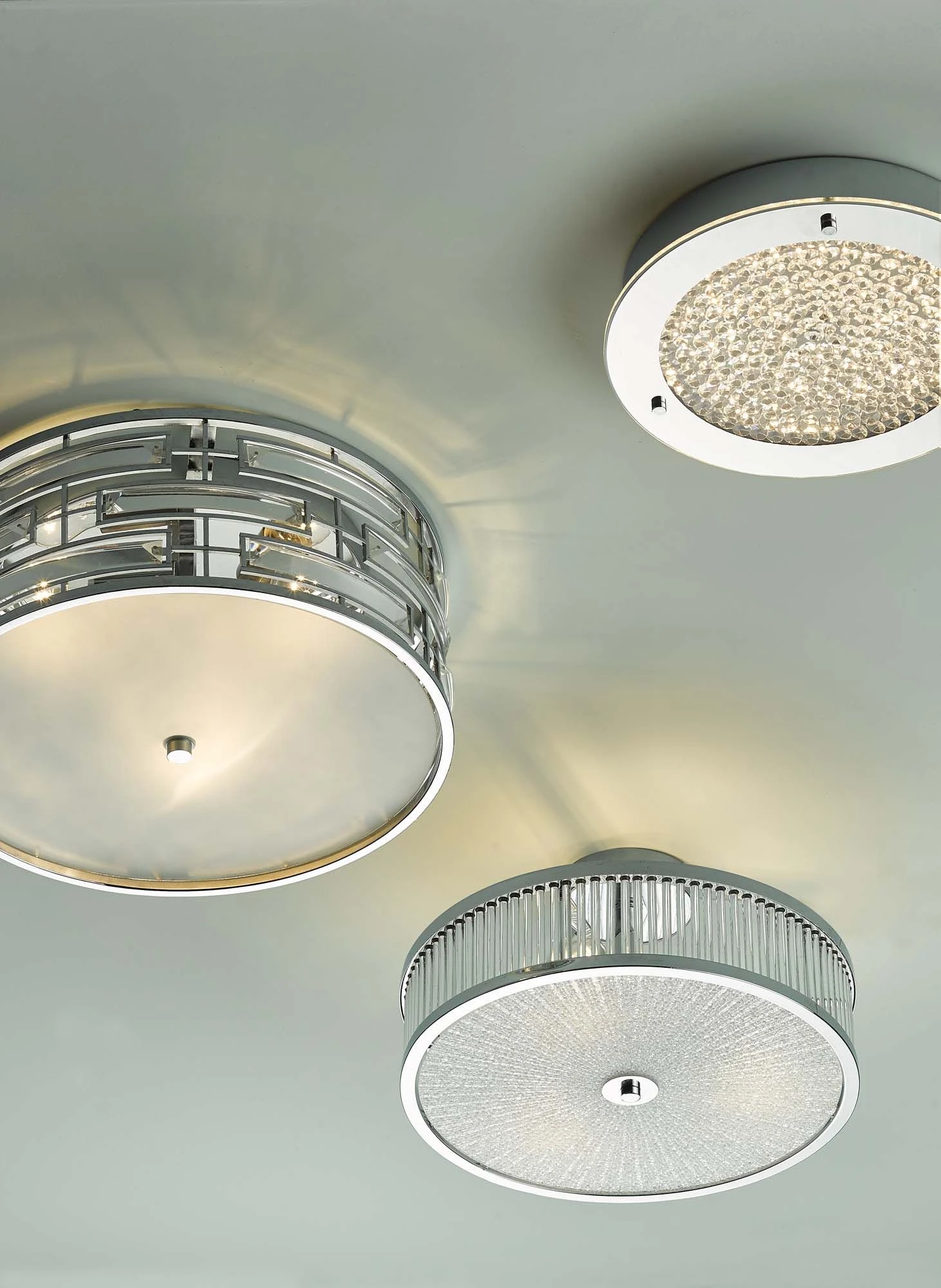 The ARAMIS 3lt Flush fitting features a patterned glass diffuser and glass rod decoration to side.