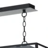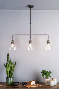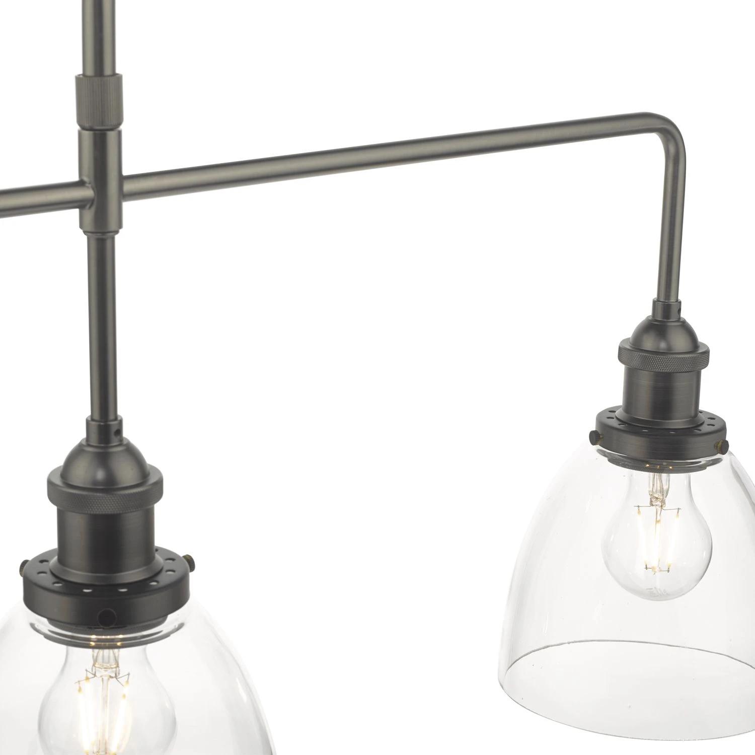 The pendant is complete with an adjustable head for angled ceilings and features an antique chrome finish with detailed metalwork and clear glass shades.
