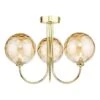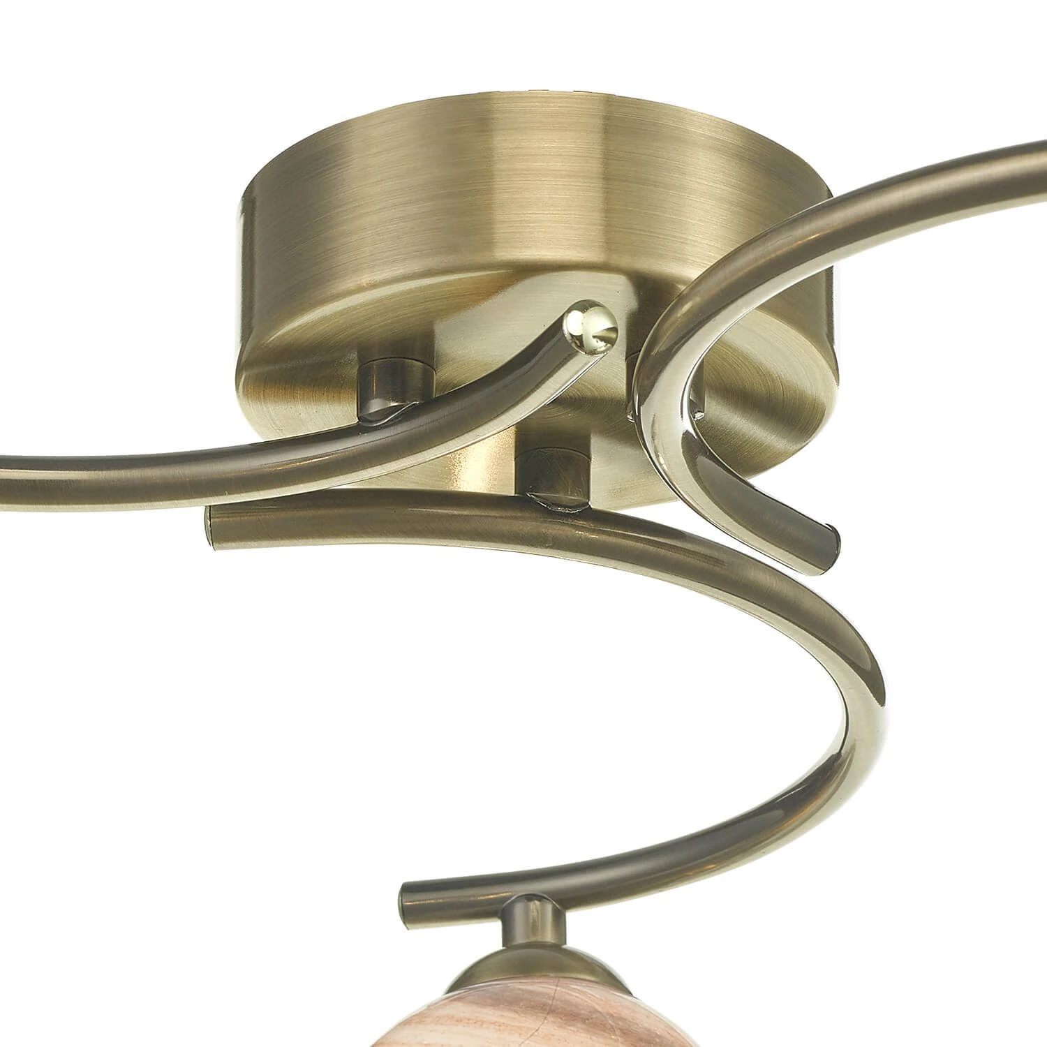 The ATIYA semi flush 3 light ceiling light in antique brass and planet art glass. The ceiling light is specifically designed to be very close to the ceiling for use in low ceiling rooms such as new build houses or small cottage.