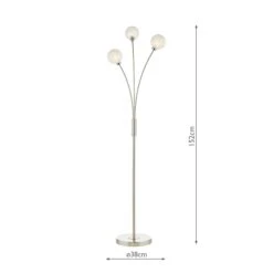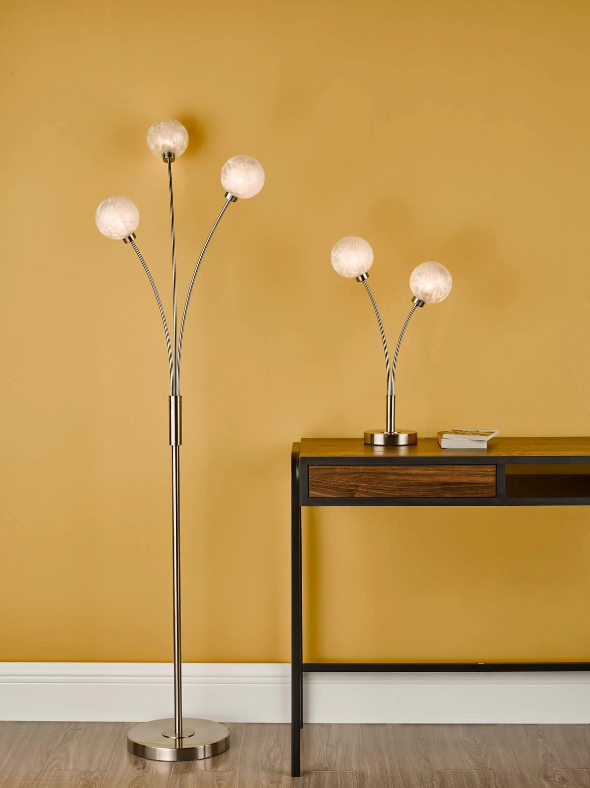 The AVARI 3 light floor lamp in a satin nickel finish and frost effect glass shades. The frosted glass gently diffuses the light, which makes this a perfect floor lamp for adding a bit of ambient mood lighting to your living space.