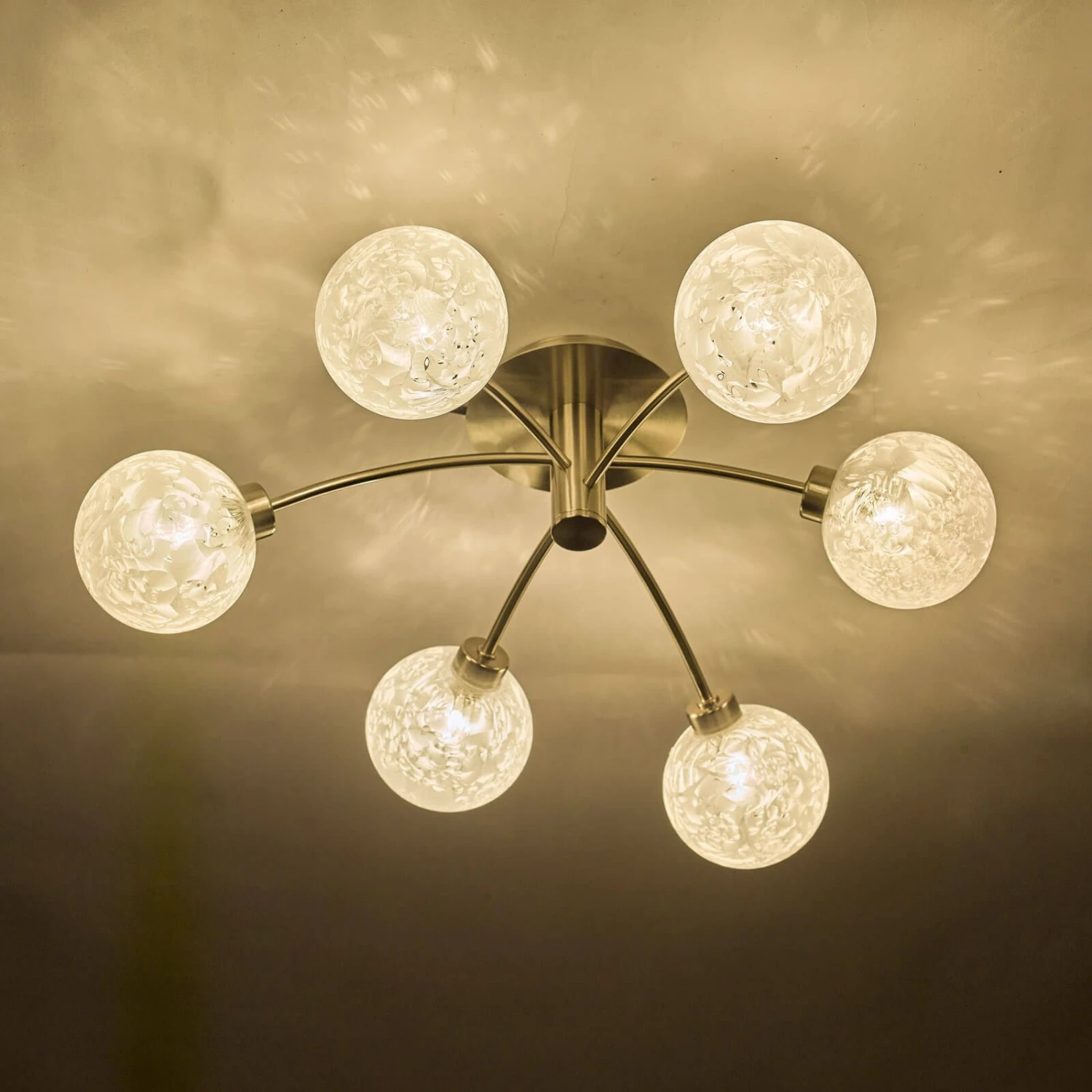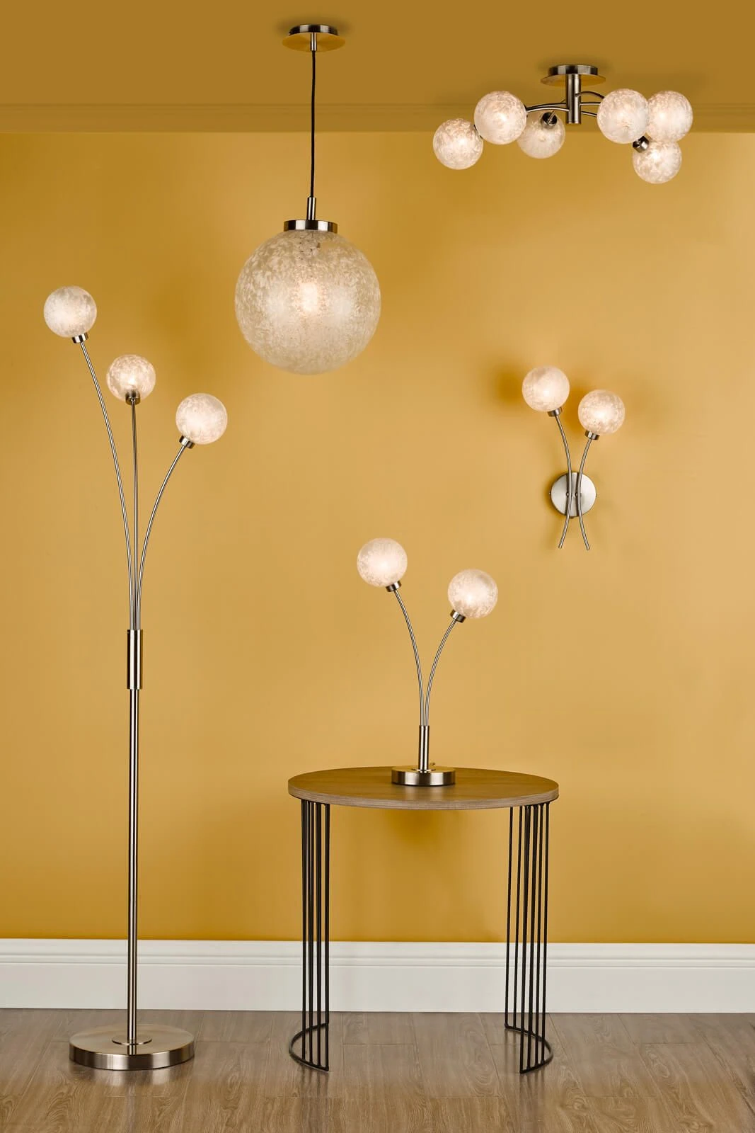 The Avari 6 light Semi Flush Ceiling Light has glue chip glass shades, which gives the illusion of spheres of ice crystals. Finished in satin nickel, this fitting would look sophisticated in any living space. Available in a floor lamp, wall light, semi-flush and pendant.