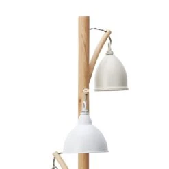 The BLYTON Floor Lamp features a light wooden frame and 3 metal retro-styled shades in muted cream and grey tones, suspended by a braided cable.