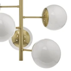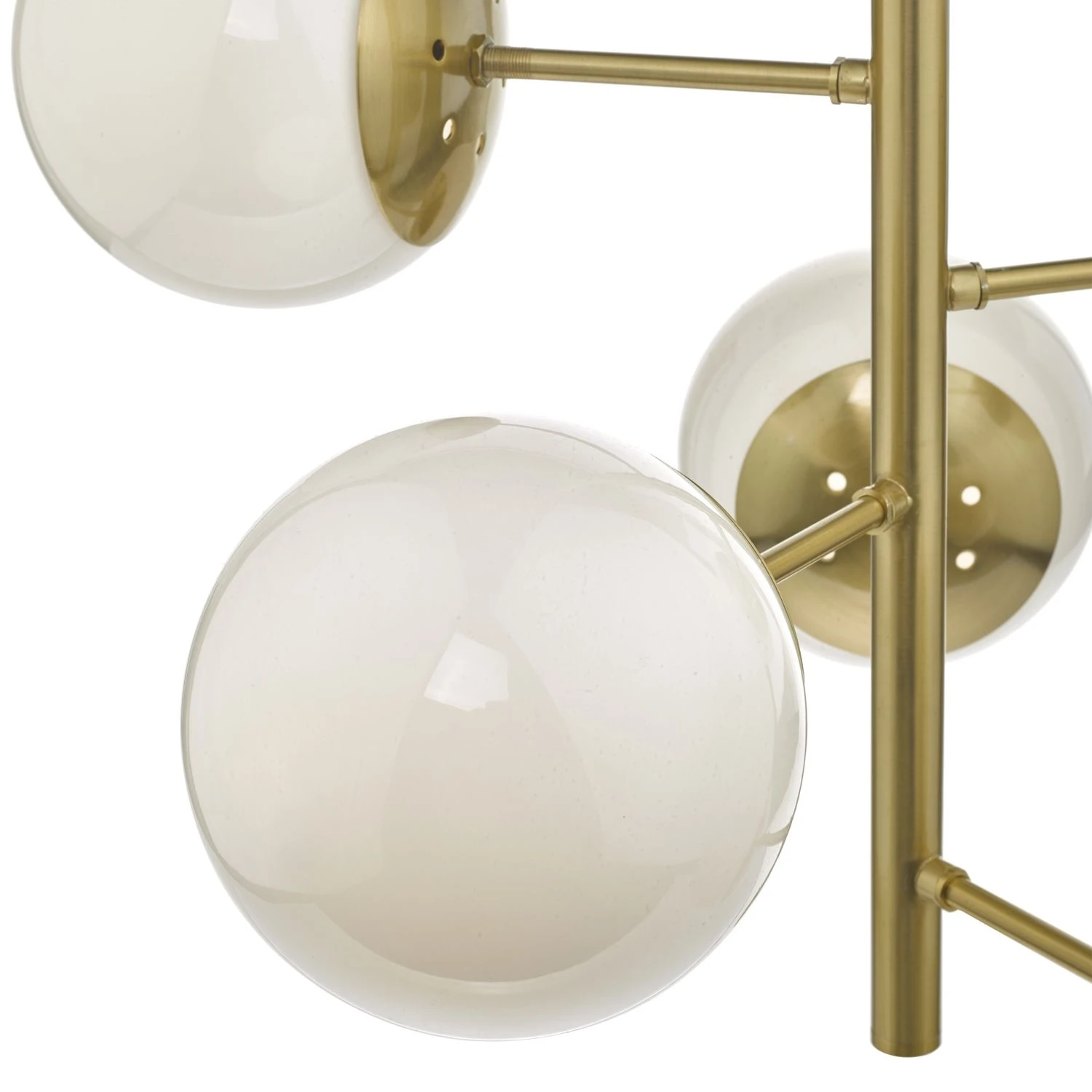Oversized opal glass globes are mounted on a natural brass frame with a height adjustable rod suspension.