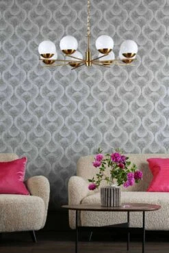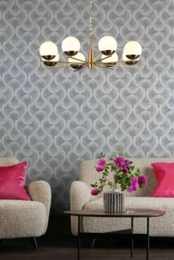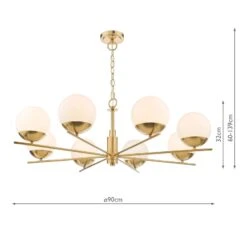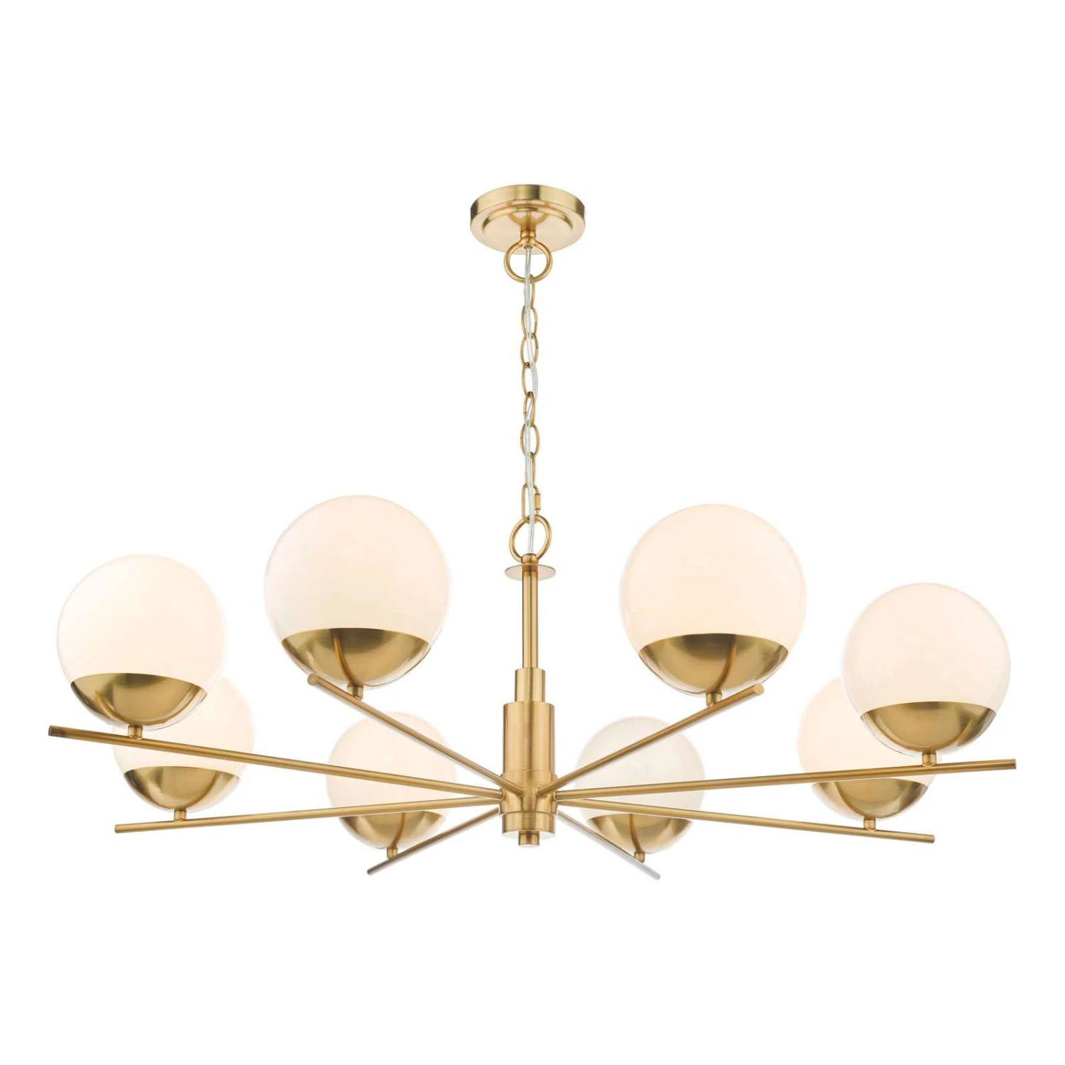 The 8 light bombazine ceiling pendant is inspired by mid century atomic design. This design era was heavily inspired by the space race. This design features a flat sputnik light structure with oversized opal glass shades perching on fine radiating arms. The bombazine 8 light pendant has a large diameter, but the height is quite shallow, meaning it can be placed where ceilings aren’t so high, equally it comes with 1 metre of chain allow it to be adjusted to suit your room on installation.