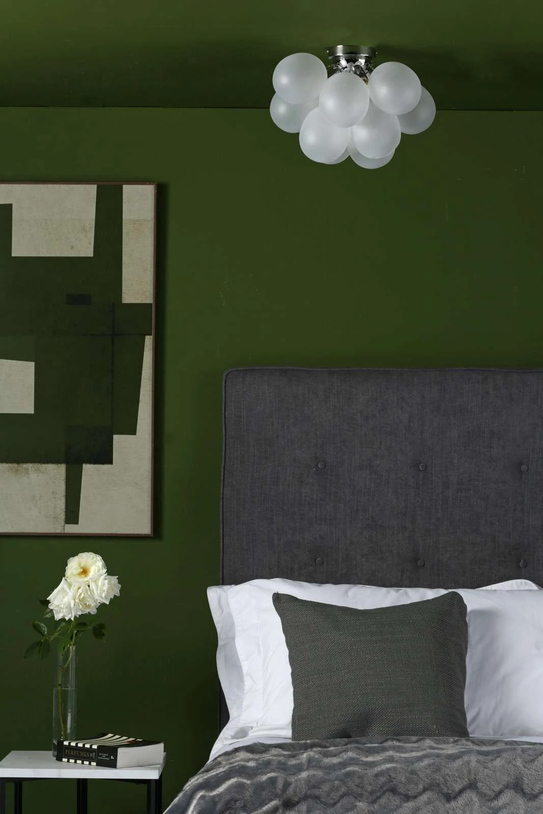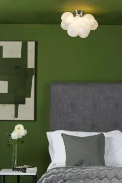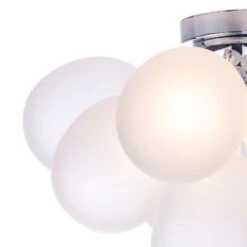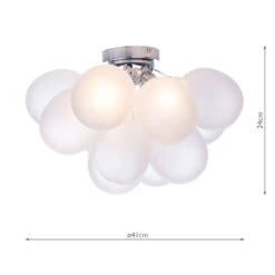 The Bubbles 4 light glass semi-flush ceiling light features layers of closely packed hand blown frosted glass bubbles, nestled around a polished chrome centre. It’s often remarked on as being the Cloud Chandelier. However you call it’s a fun ceiling light giving a soft glow where ever it’s placed, it looks great in the bedroom or lounge. Be warned the hand blown glass is fragile and be careful when hanging or assembling, we of course stock spares.