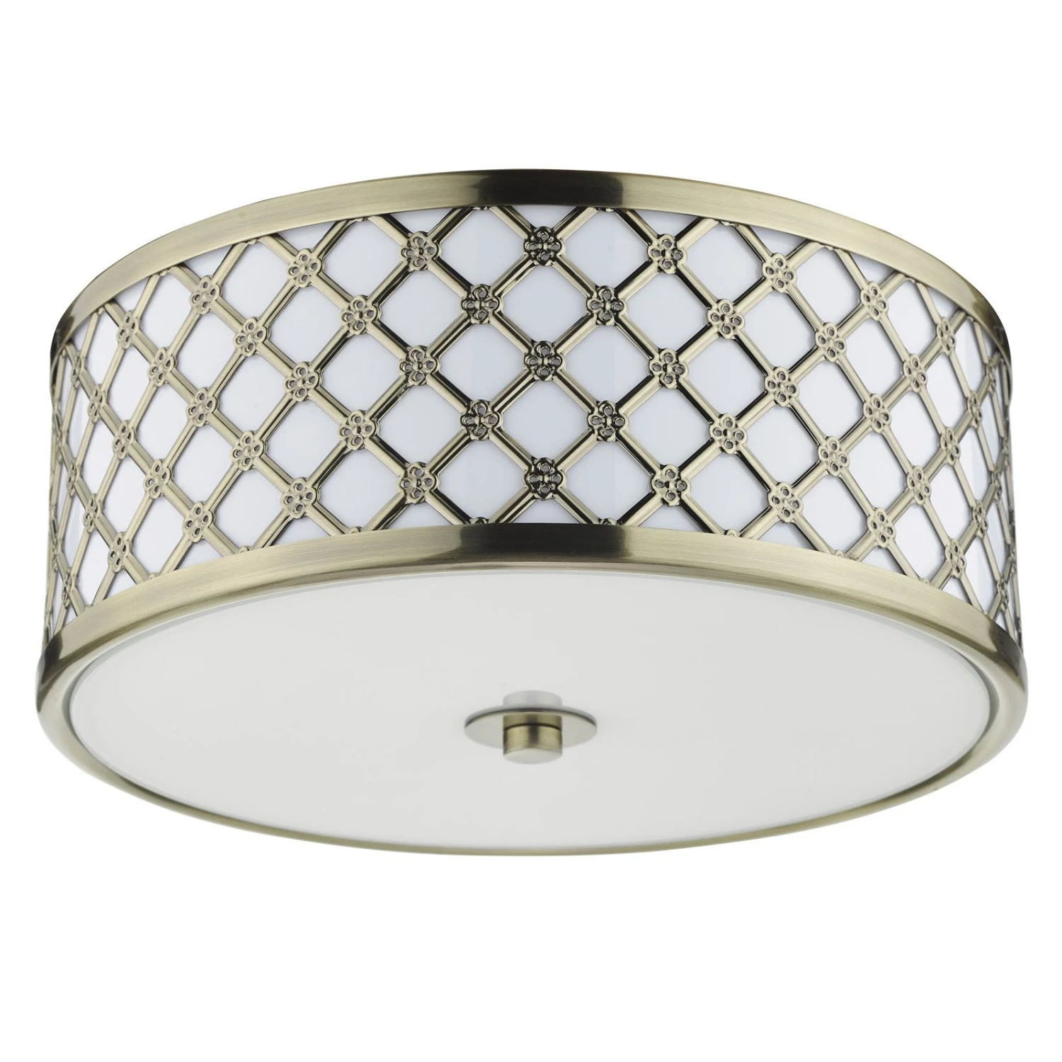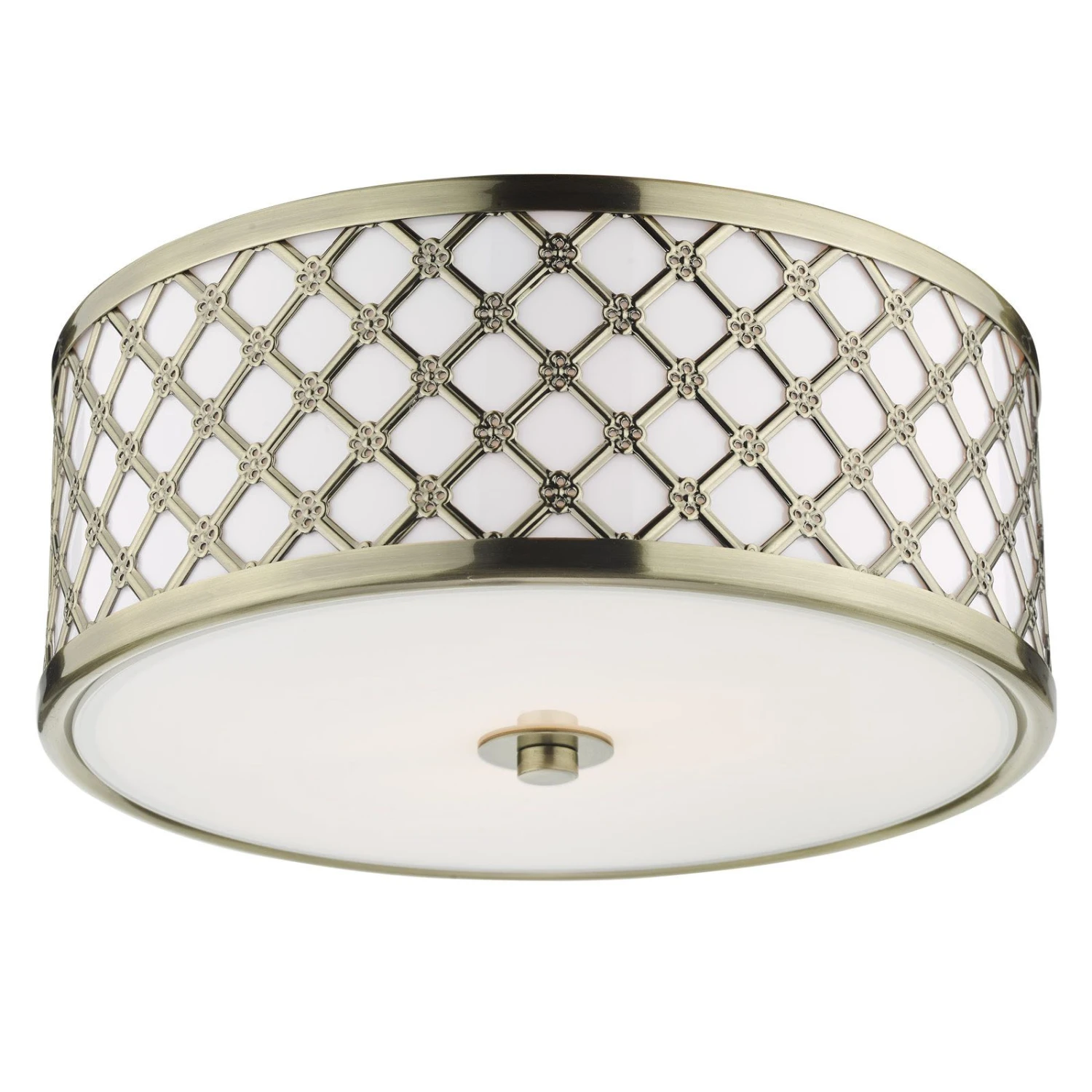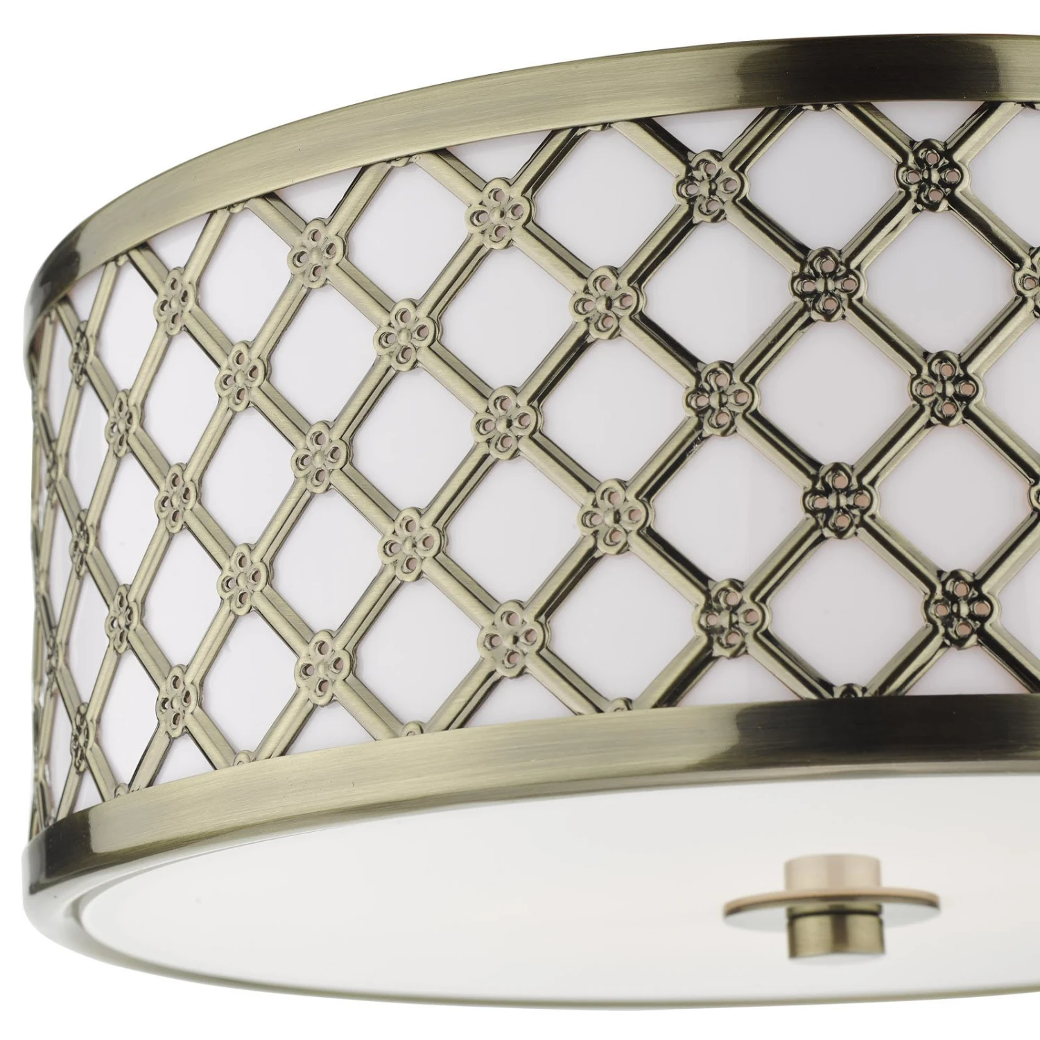 The timeless Civic double-light flush fitting features open fretwork in a geometric pattern on the outer frame, which is finished in warm antique brass, laid over a frosted glass inner.