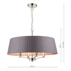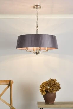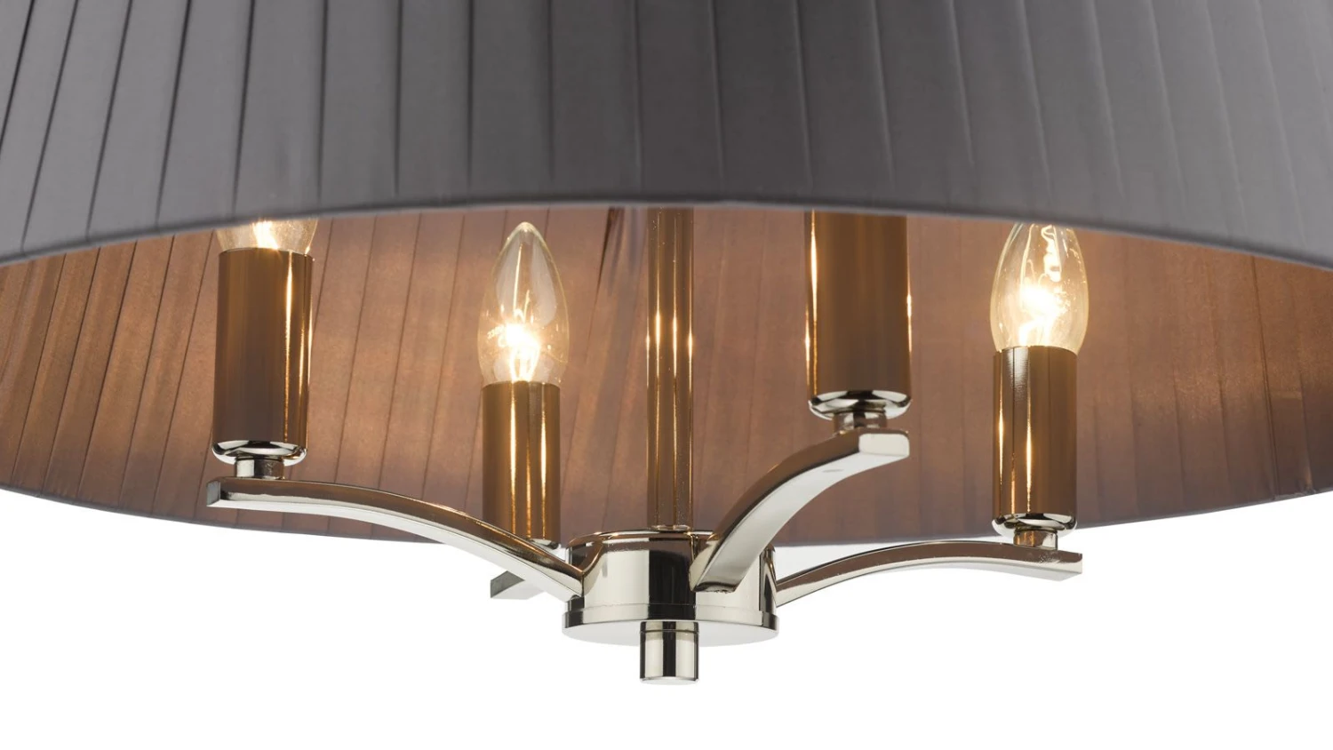 The Cristin is an elegant four-light pendant in a vintage polished nickel finish. A simple, tapered shade surrounds the four lamp holders. This rather special shade is hand wrapped in a grey ribbon. The layers of ribbon are visible both inside and outside the shade, giving the Cristin a beautiful appearance from any angle.