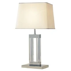 The DOMAIN Table lamp has a polished chrome and quartz glass frame, completed with a cream linen shade with feature chrome edge trim.