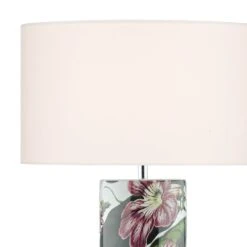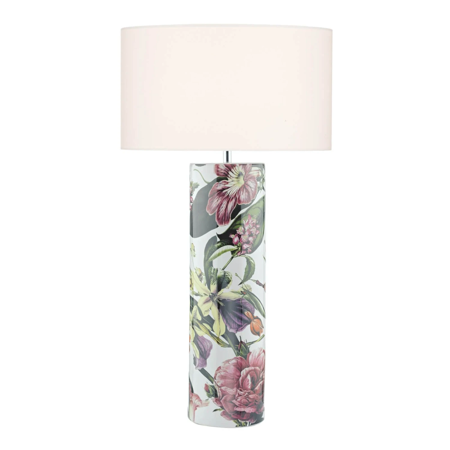 The elegant Elana ceramic table lamp has a tall, cylindrical shape with a detailed and vibrant botanical print featuring large pink blooms with green leaves on a white ground. This colourful lamp base will bring the outdoors in.