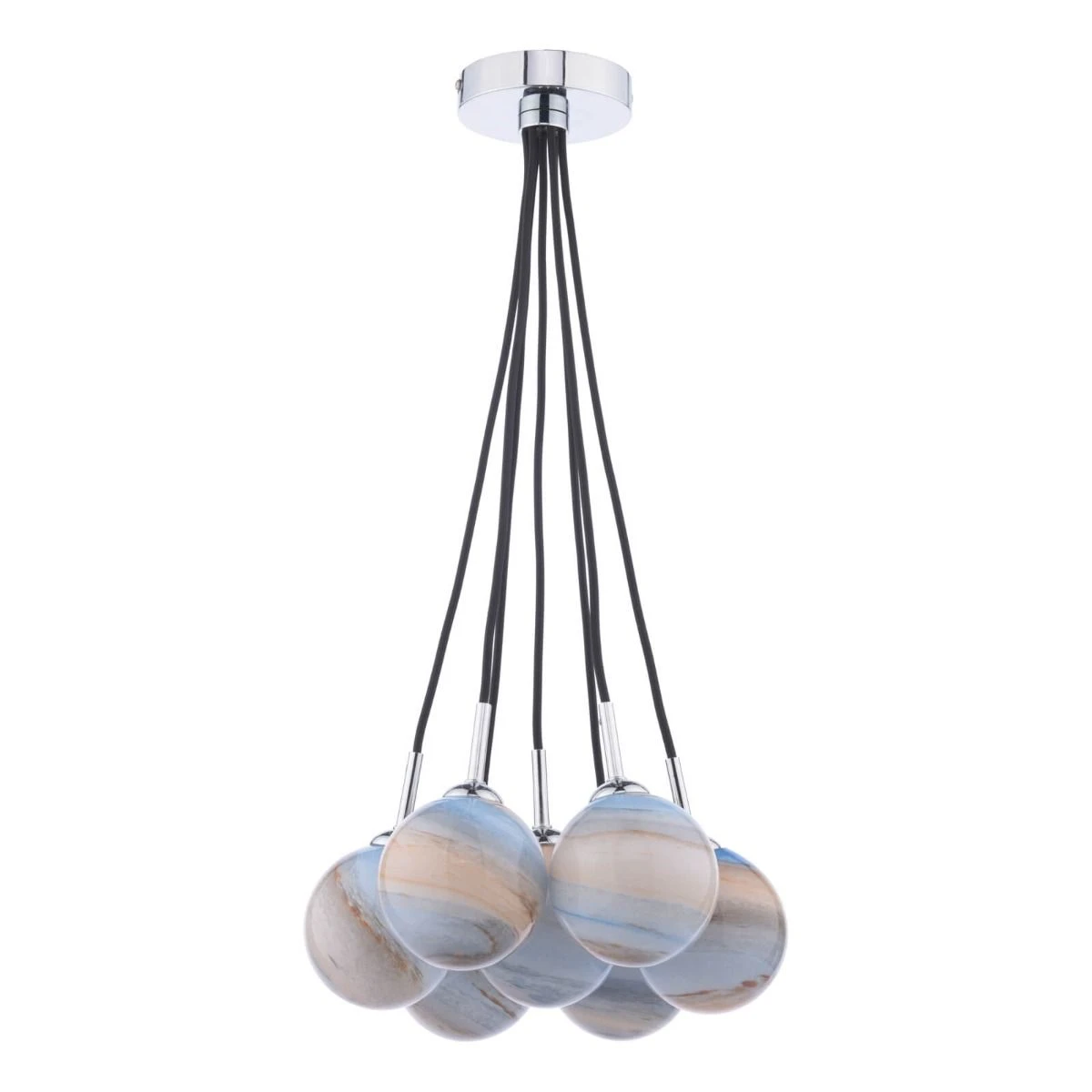 A seven-light cluster pendant with a polished chrome ceiling plate, black fabric cables and planet art glass shades. The Elpis cluster pendant can be hung with the glass all at the same level creating a bunching effect or it can be adjusted with the help of your electrician to have the glass at different levels for a different look.