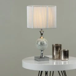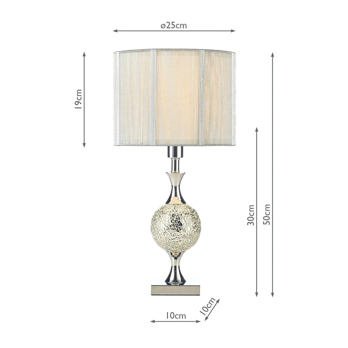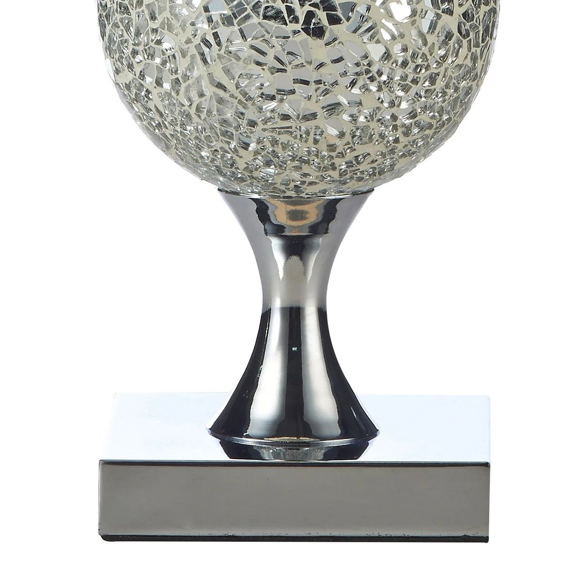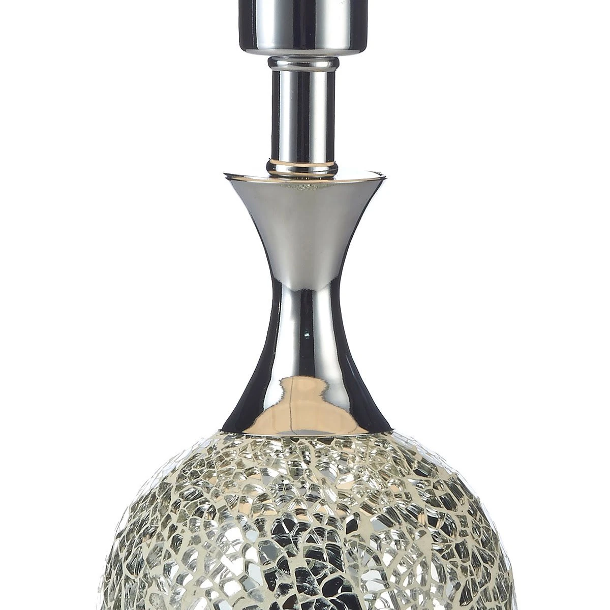 The classically shaped but contemporary styled ELSA Table Lamp has a bright polished chrome and mirror glass base with silver mosaic detail. Set on a square plinth, it comes complete with an elegant fabric drum shade in silver.