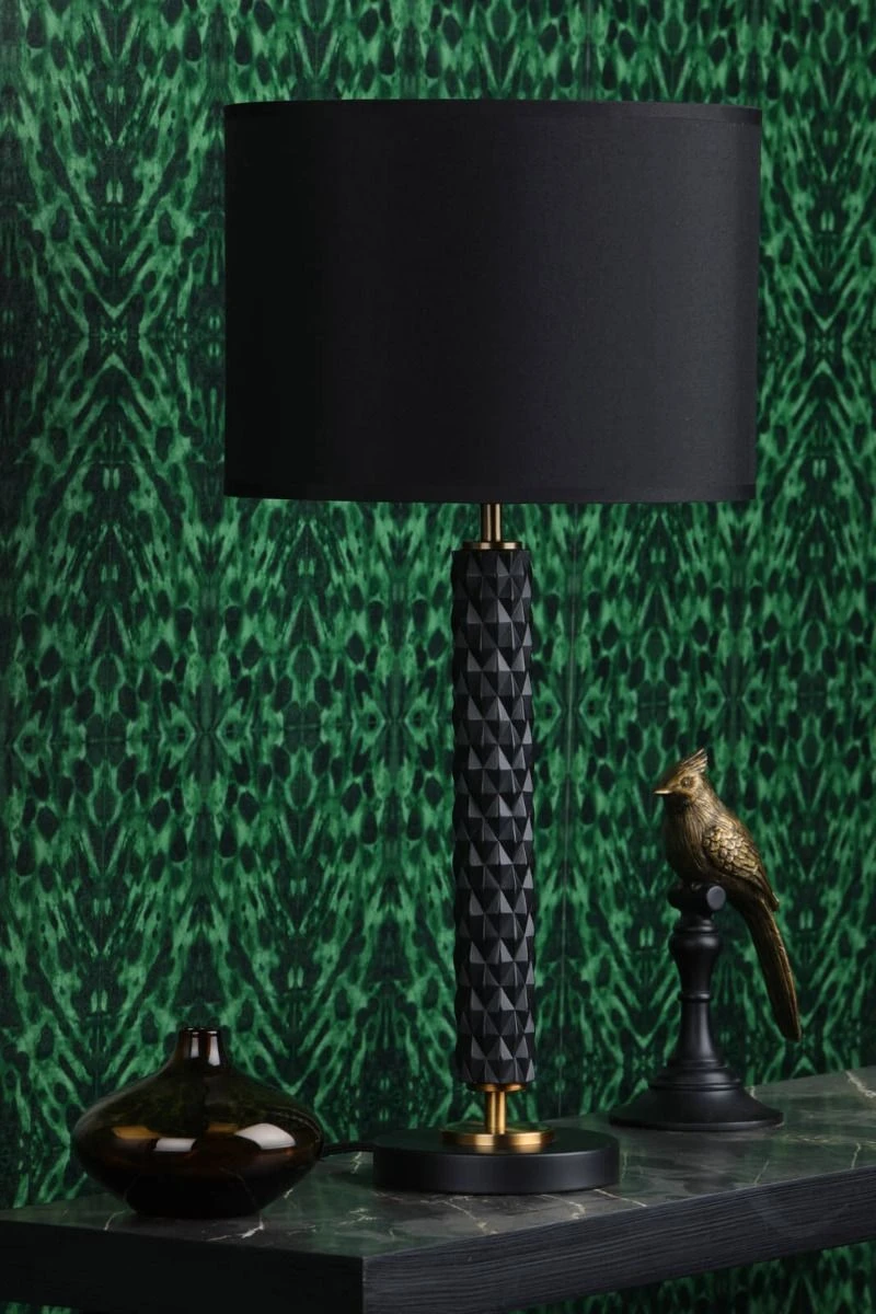 The Emani table lamp is an edgy design with a slender stem textured with black punk studs; aged brass details lift this black lamp to a luxurious level.