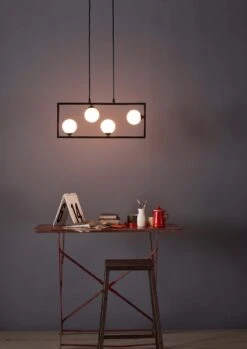 The Ensio 4 Light Pendant; a geometric pendant with eye-catching opal glass spheres in a graphical matt black frame. Perfect for hanging over a dining area or living space.