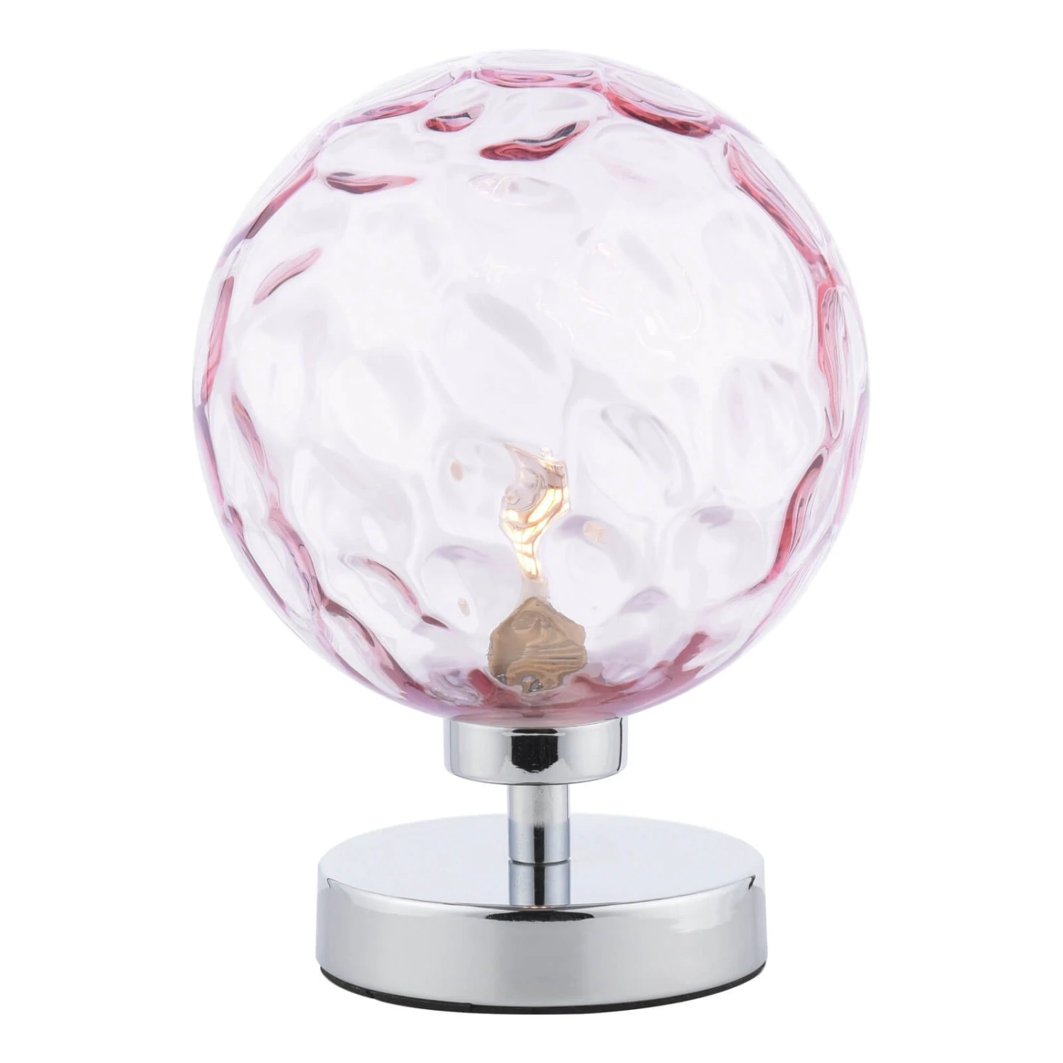 The ESBEN touch table lamp in polished chrome with large pink dimple glass. The touch lamp can be switched on with a light touch anywhere on the metal base. The Esben table lamp is also available in various finishes with different glass options.