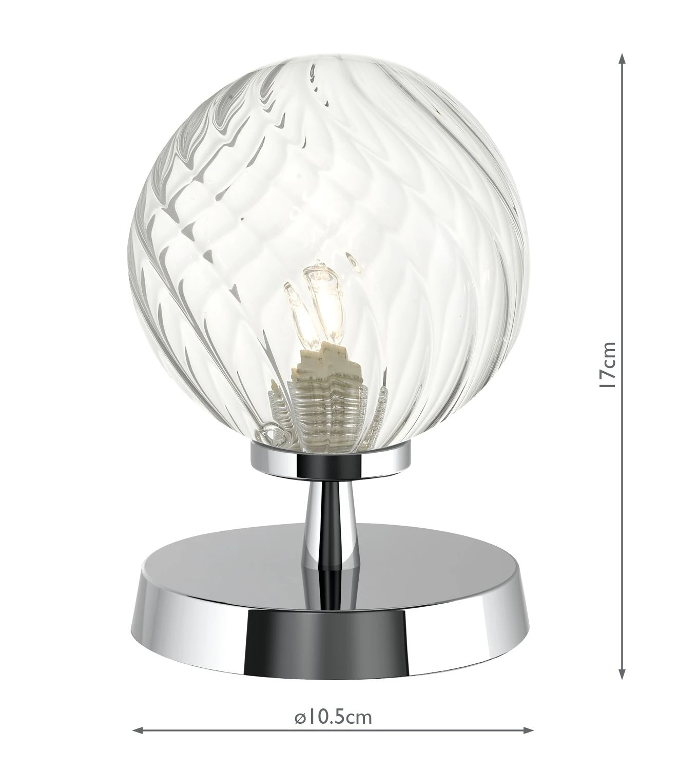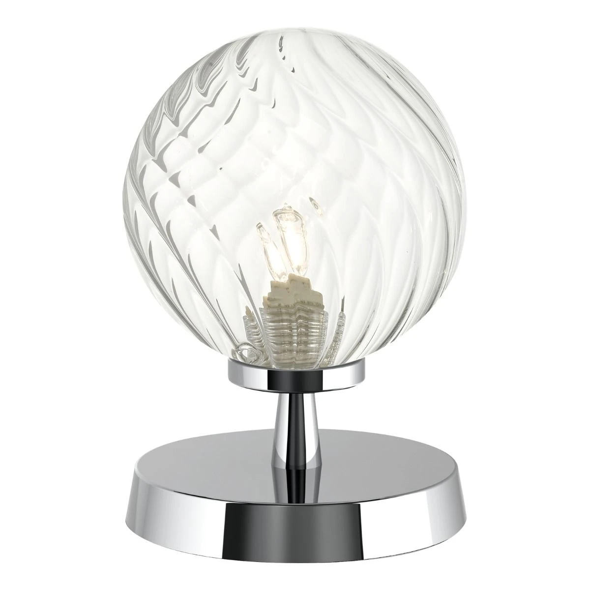 The ESBEN touch table lamp in polished chrome and twisted clear glass. The touch lamp can be switched on just with a light touch anywhere on the metal base. With a contemporary polished chrome finish the Esben touch lamp adds a touch of elegance to any room. The twisted clear blown glass shade gives a wonderful lively light when switched on, but looks equally beautiful when off.