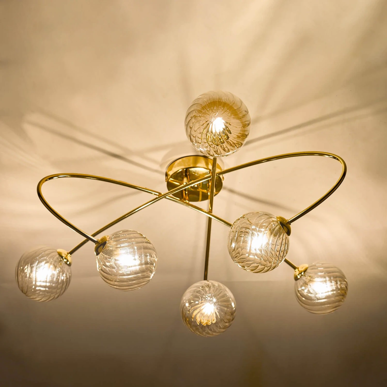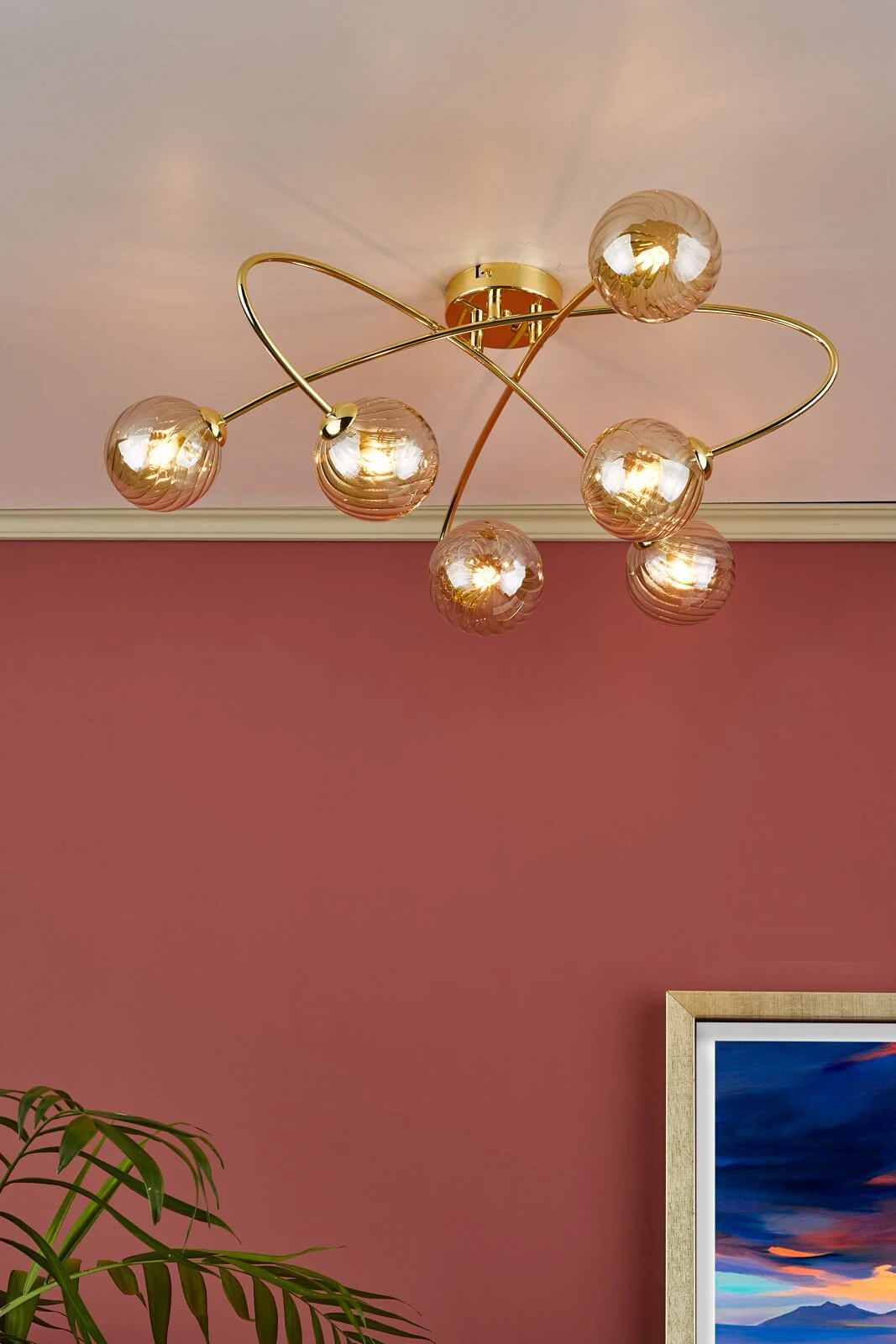 The contemporary Etta 6 light semi-flush ceiling light features long sweeping arms and twist ribbed glass shades. The Etta semi-flush ceiling light’s large diameter and low height make it a perfect choice for large rooms with low ceilings, such as living rooms, bedrooms or dining rooms.