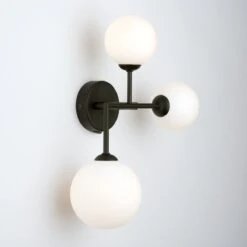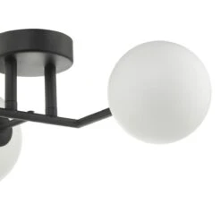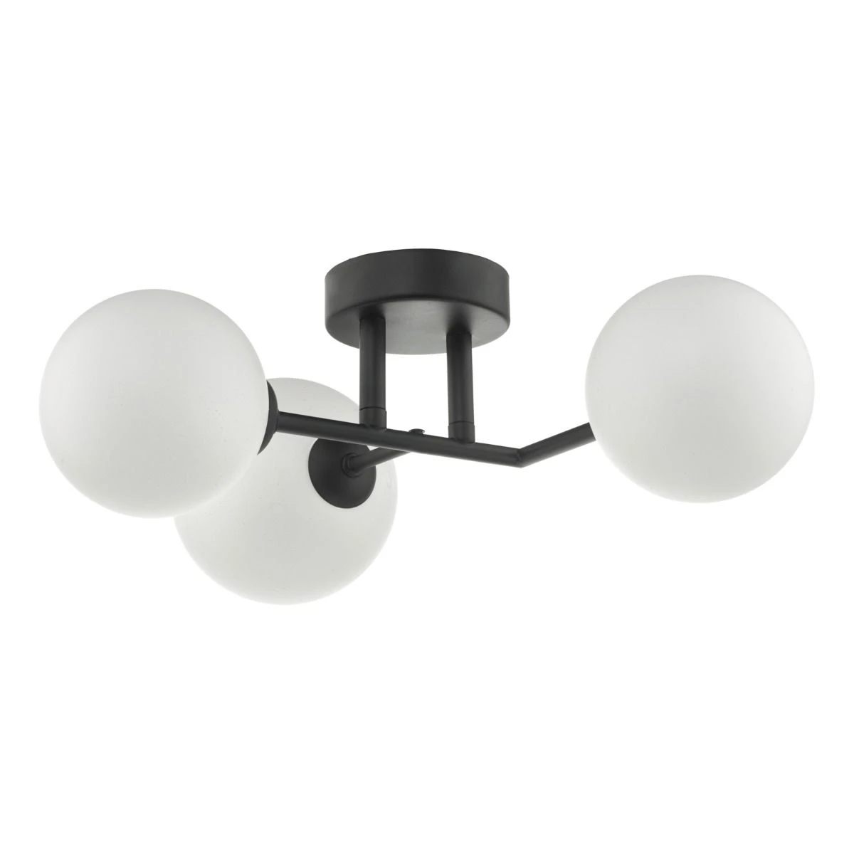 The elegant EUAN 3lt features matt black arms that hold three round opal glass shades creating an understated cosmic aesthetic.
