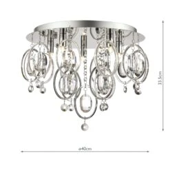 The Evangeline is a contemporary glass and crystal flush ceiling light with bags of style. The faceted crystal lozenges hung in the clear glass loops catch the light and the beads add sparkle. A unique design, this 5 light ceiling fitting will bring great style to lower ceilings.