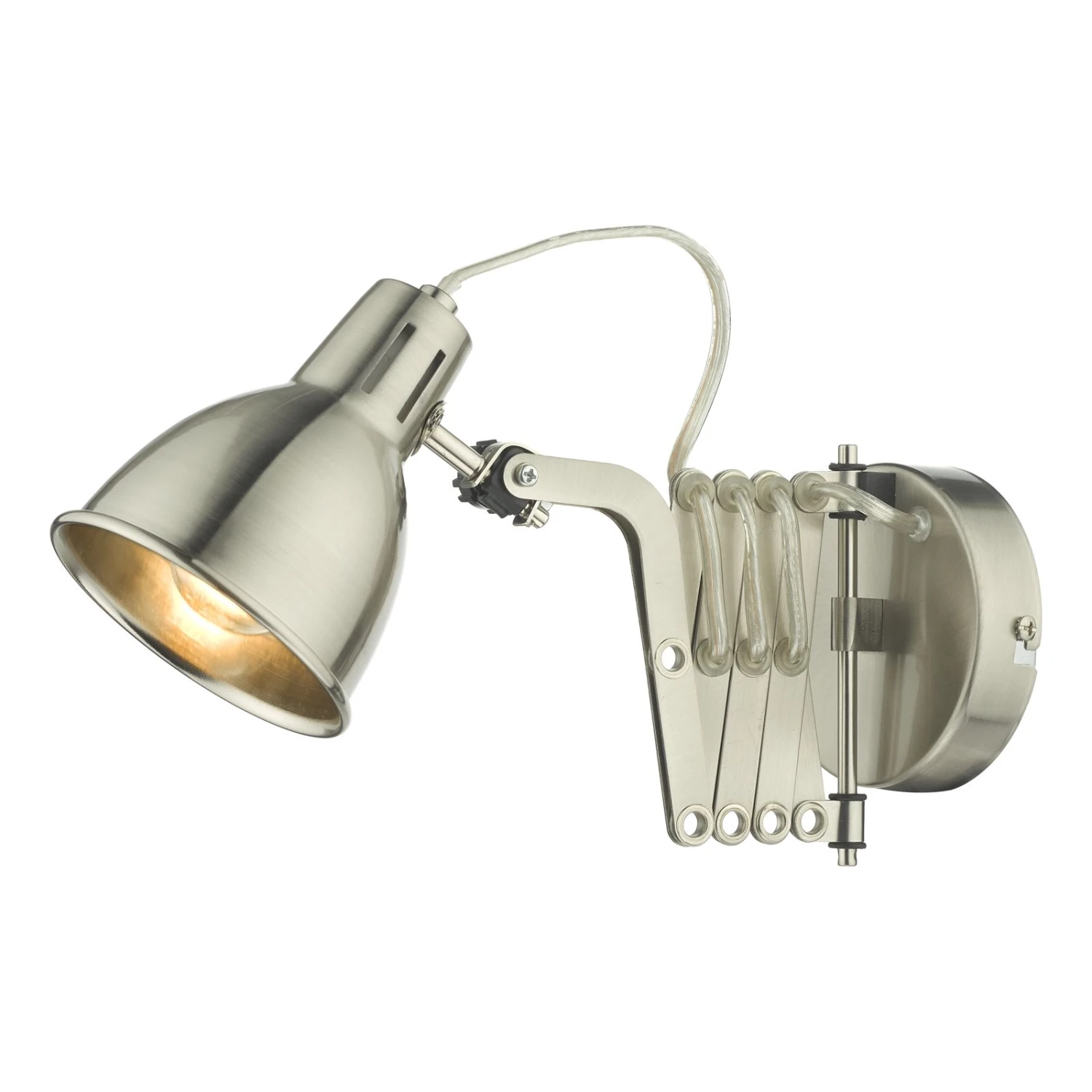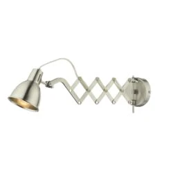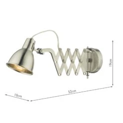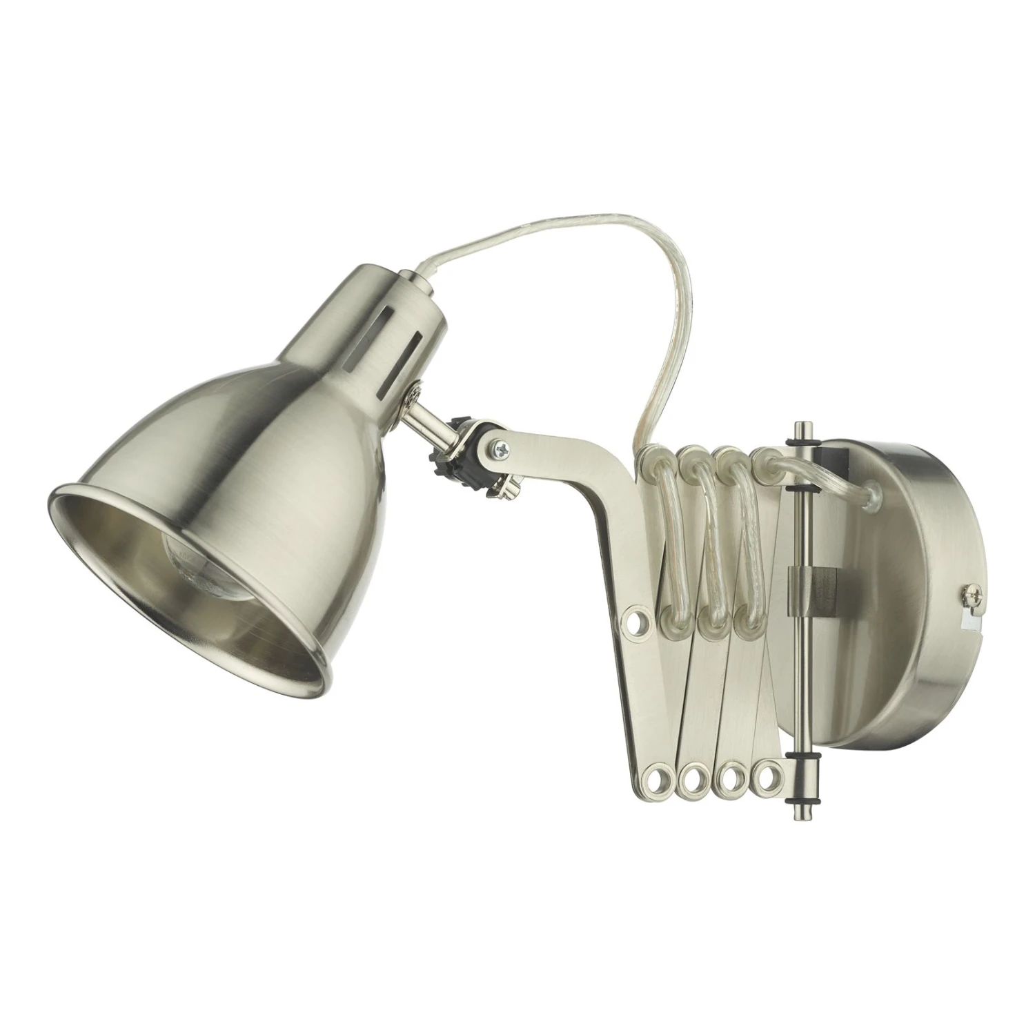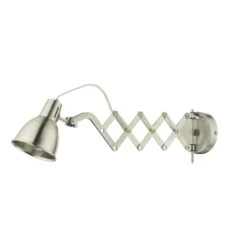The FAXON 1 light in-door extendable wall light has a spotlight style head in satin chrome. Simple and compact when folded back it stands 29cm proud of the wall and fully extended 59cm from the wall. The spotlight head is fully adjustable and the arm can sweep through 180 degrees pivoting from the wall fixing plate. This makes it a great directional light and a great feature light. It is very useful as a task light that can be pulled out over a working surface and folded back when not needed. It operates from a light switch.