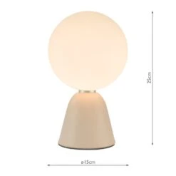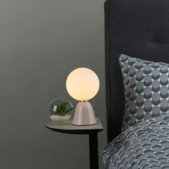The FRANCESCA Table Lamp features a metal base finished in a delicate shade of pale pink topped by a white opal glass sphere encasing a G9 lamp holder. The metal detail is brass. This petite table lamp has a luxury grey braided cable and a convenient in line switch to save having to reach down for the plug to operate the table lamp.