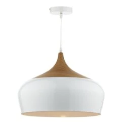 The GAUCHO 1lt Large Pendant features a white high-gloss ceiling plate and matching metal shade with feature wood effect cap detail.