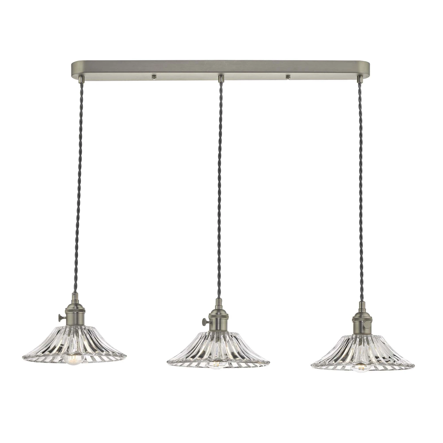 This version has a trio of vintage-look flared cone shades in waterfall ribbed glass, complemented by the sophisticated antique chrome ceiling bar and lamp holders.