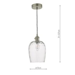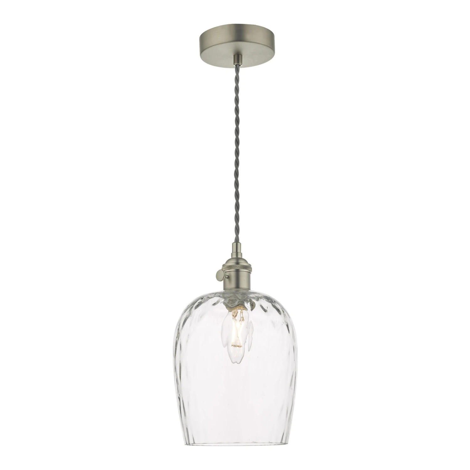 This version has a vintage-look rounded jar shade in dimpled glass, complemented by a sophisticated antique chrome ceiling rose and lamp holder.