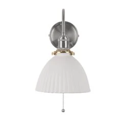 The Hadano Wall Light Antique Chrome & Ceramic Domed Shade is a beautiful wall light with a fine ribbed white ceramic shade and antique chrome frame. When lit, the shade gives off a lovely warm glow that evokes images of country farms and vintage kitchens. The pull cord switch is hidden behind the fixture, allowing you to turn the light on and off with ease. The Hadano wall light features a simple yet stylish design that would look great in a hallway, kitchen or dining room.