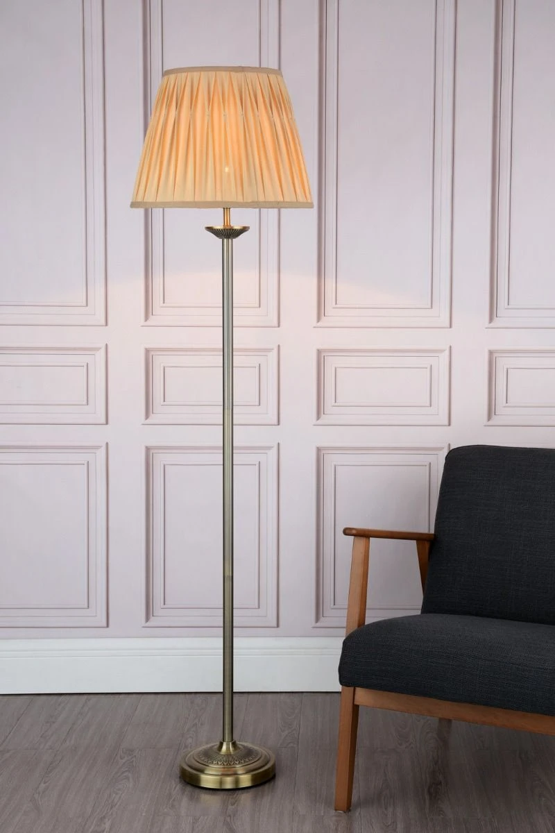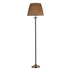The Hatton floor lamp is a classic design with a ribbed stem and decorative base, finished in antique brass, complete with an elegant pinch pleat grey gold silk shade. Fitted with a cable mounted foot switch for ease for use.
