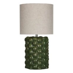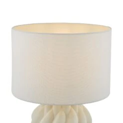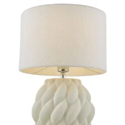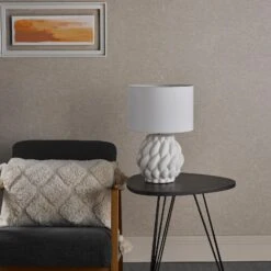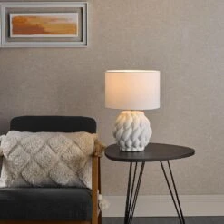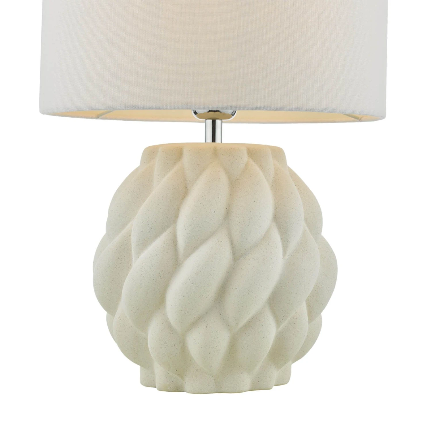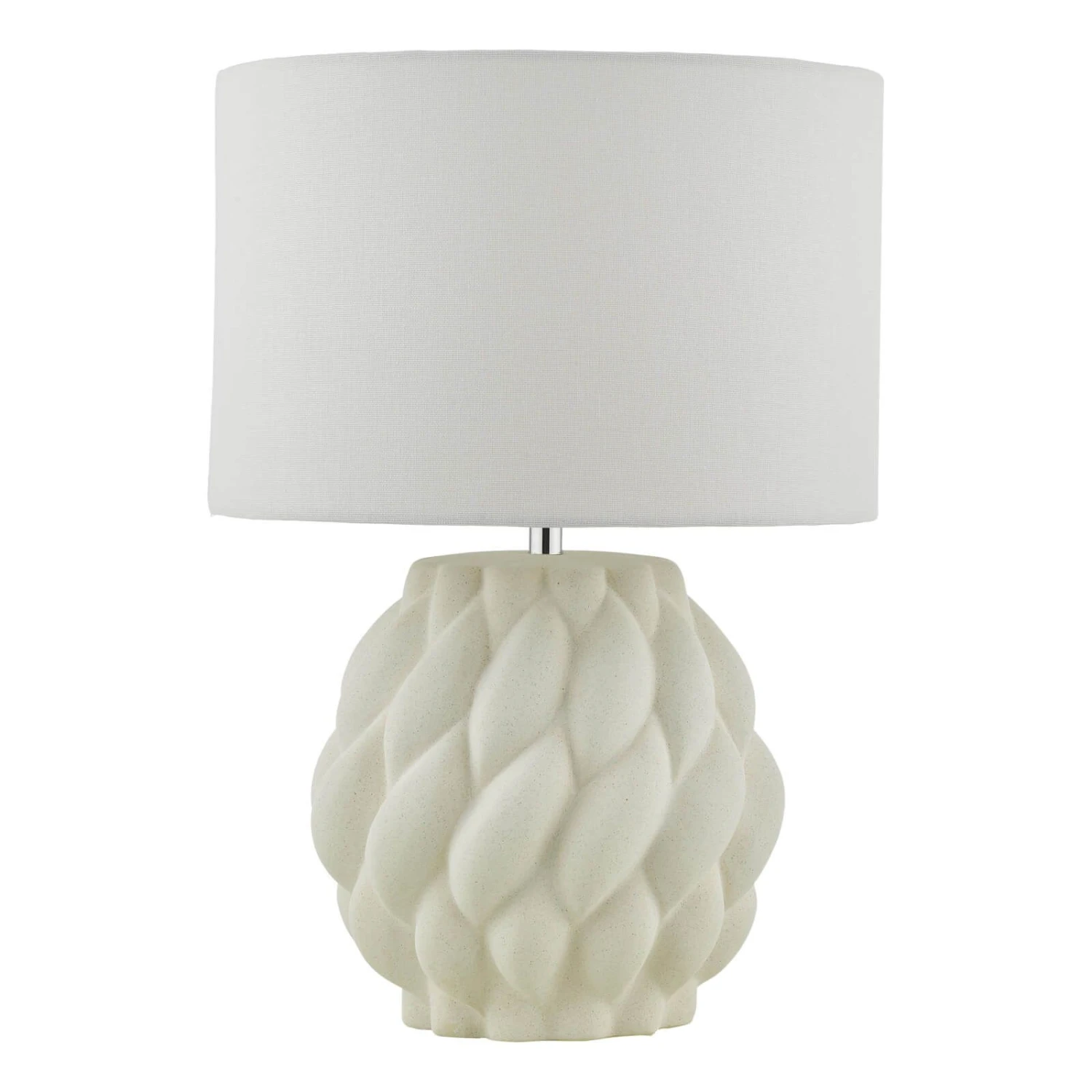 The IDONIA TABLE LAMP is inspired by a jumbo size ball of yarn, complete with matching white linen shade. The tactile stone like finish is reminiscent of fine natural materials. The Idonia table lamp features an in-line rocker switch for ease of use, and a braided white cable. Whether reading or relaxing, this lamp adds a touch of style to any space.