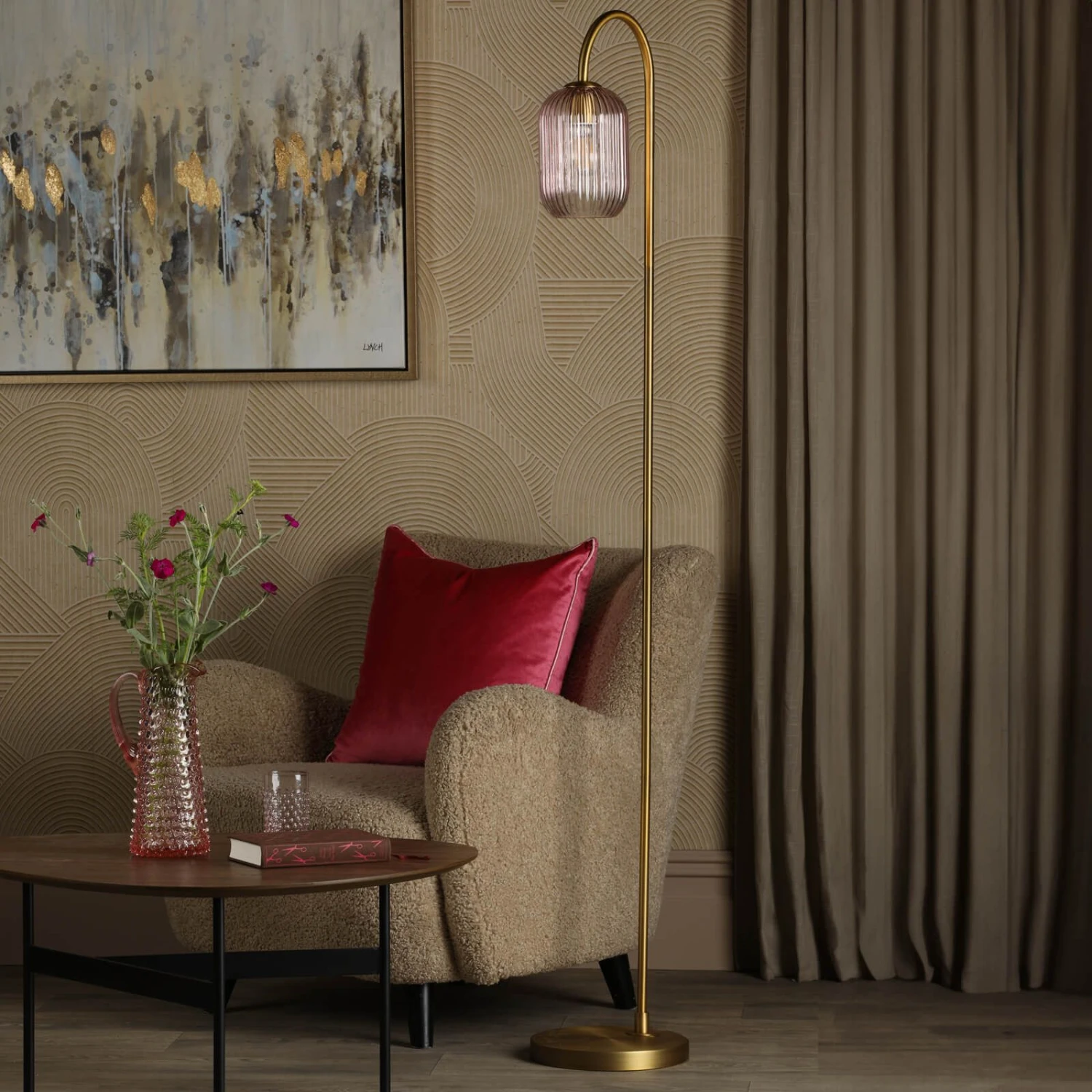 The Idra Floor Lamp casts an elegant glow in any space with its oversized j-arm and pink ribbed glass shade. Aged bronze accents and a black braided cable add a touch of rustic refinement. Whether illuminating a reading nook or accenting a dining room or bedroom, the Idra floor lamp blends seamlessly into any setting with its understated yet striking design.