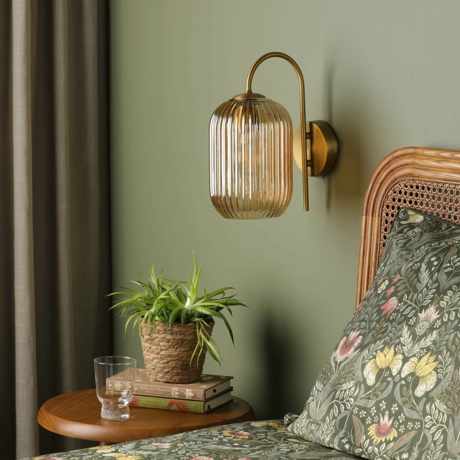 The Idra Wall Light Aged Bronze and Champagne Ribbed Glass is an elegant wall light with an oversized J-arm that allows it to be used as a pair or on its own. The Idra wall light features a pull cord switch and is made from metal with an aged bronze finish. The glass shade is champagne ribbed glass which diffuses the light from a single bulb. The Idra wall light is designed to complement modern homes with its minimalist yet stylish design.