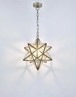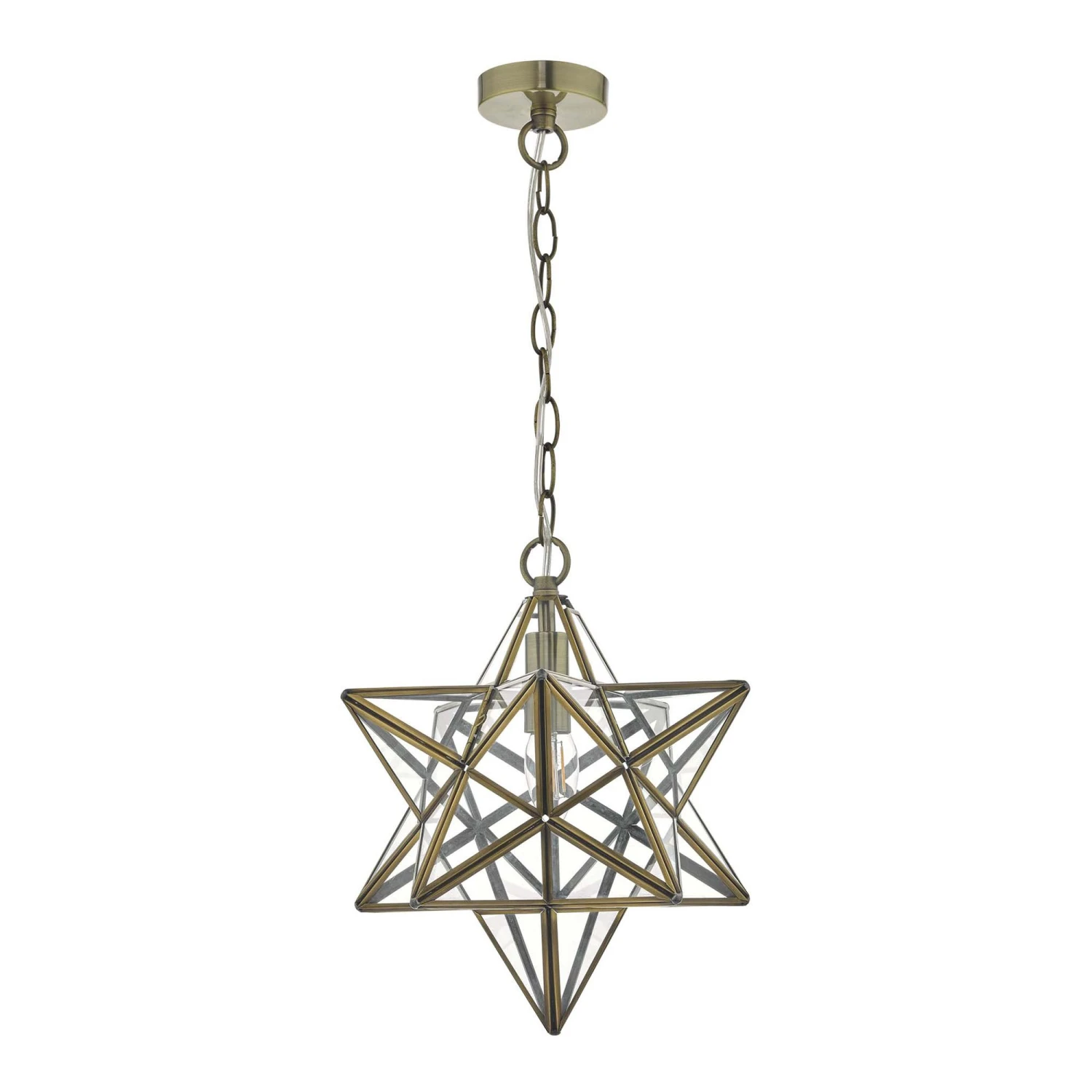 The large Ilario glass panelled star pendant features an antique brass finish with clear glass panels. This charming design is full of character and is ideal for adding character to your room.