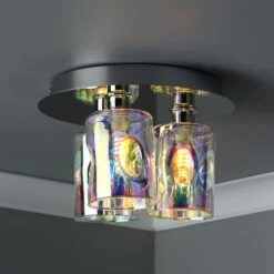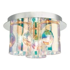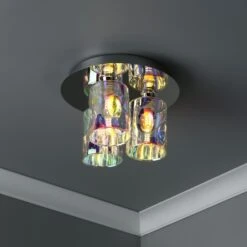 Capturing a spectrum of colours, the INTER is a flush fitting comprising a trio of highly iridised, cylindrical glass shades mounted on a reflective, mirror polished chrome plate. This eye-catching 3 light ceiling fitting will cause quite a stir in your home.