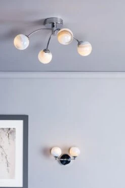 The IZZY 4lt semi flush in a timeless polished chrome finish with planet inspired glass shades.