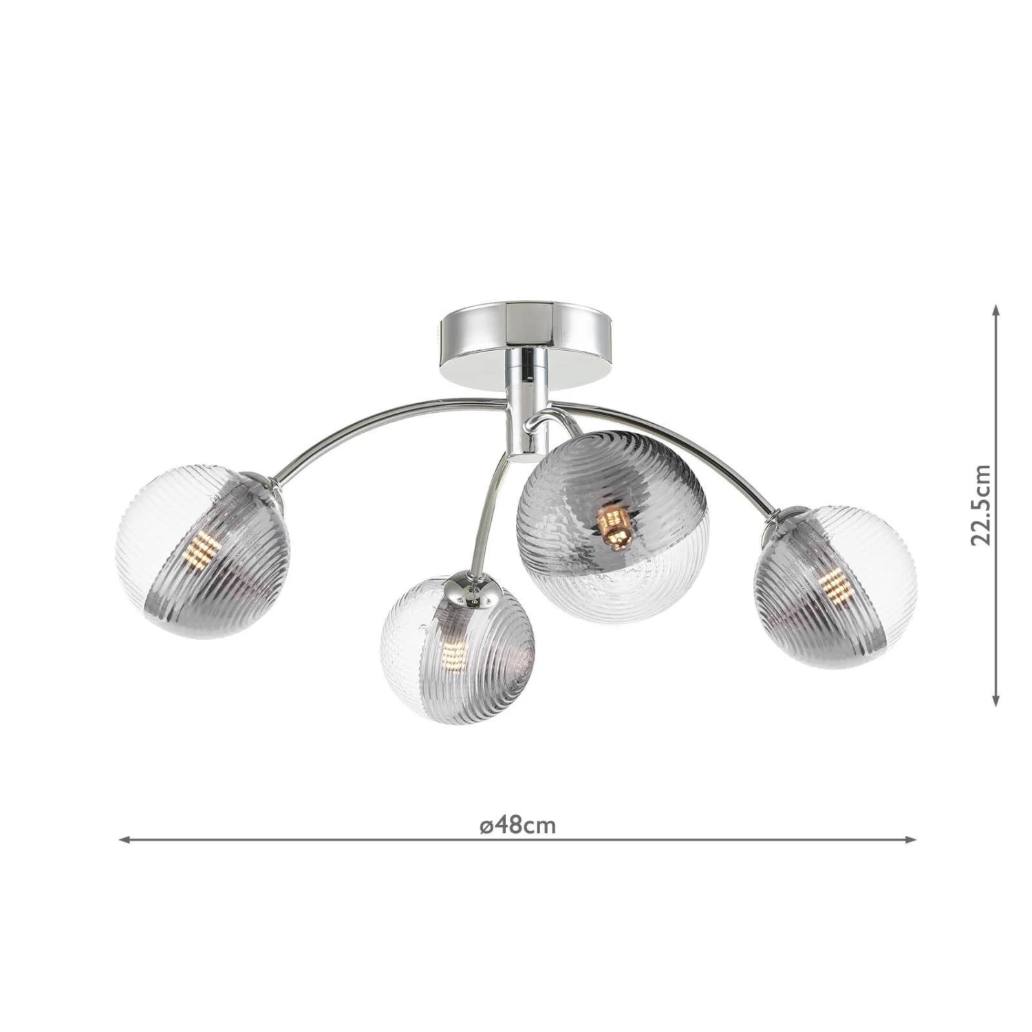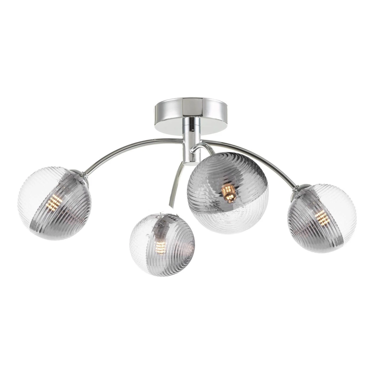 The Izzy 4 Light Semi-Flush Polished Chrome & Smoked Glass is a beautiful semi-flush fitting with a unique asymmetric glass shade, half smoked and half clear with opposing radial and linear ribbing. The sweeping polished chrome frame suits low ceilings, allowing the glass to really shine. The Izzy semi-flush is suitable for an entryway, dining room or anywhere a little style is needed.