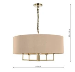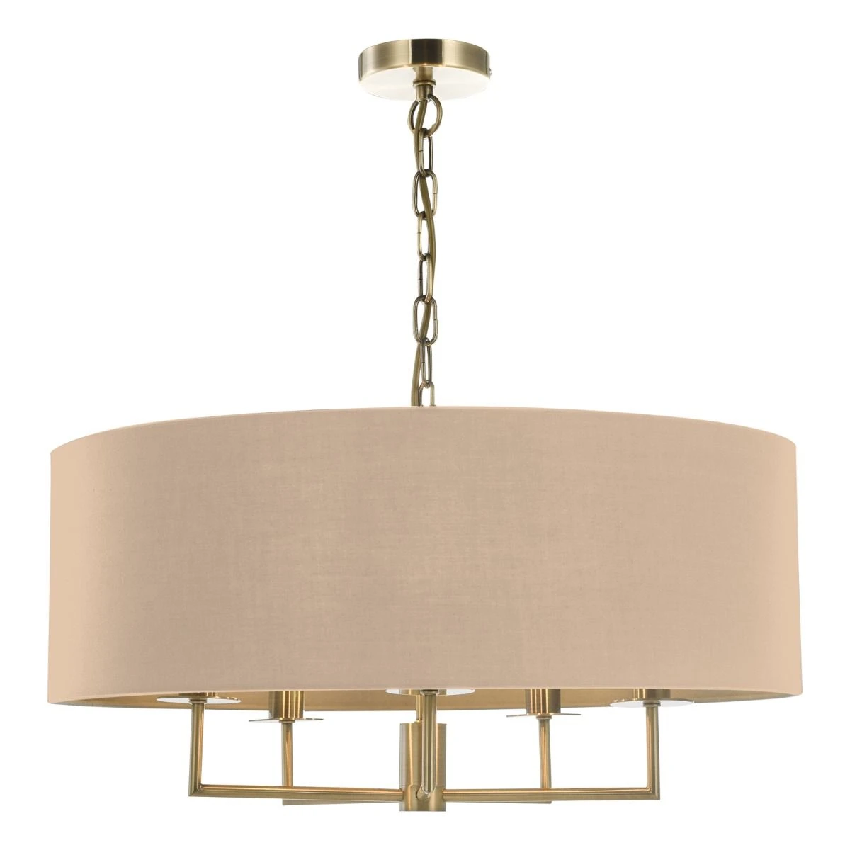 The understated Jamelia shadelier features a 5 arm pendant with antique brass metal work and a single large taupe cotton drum shade with matching lining.
