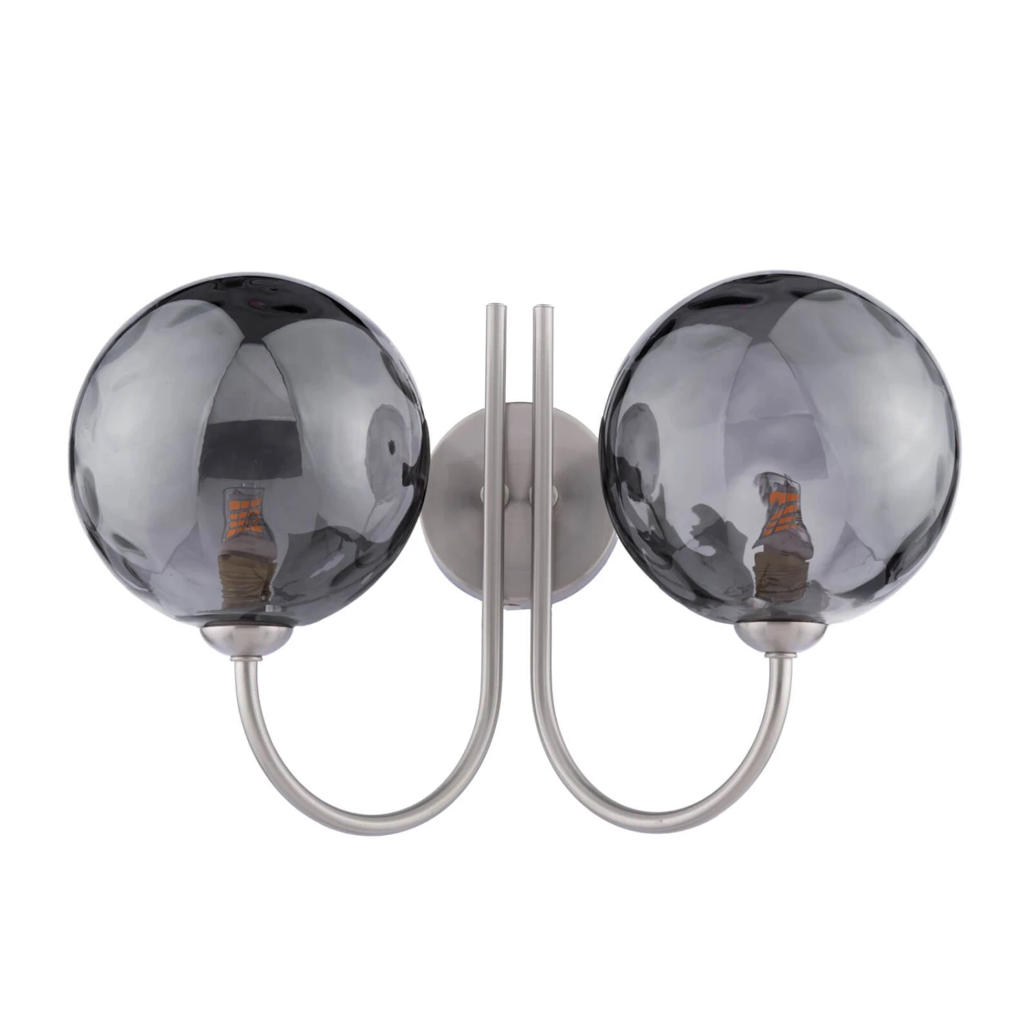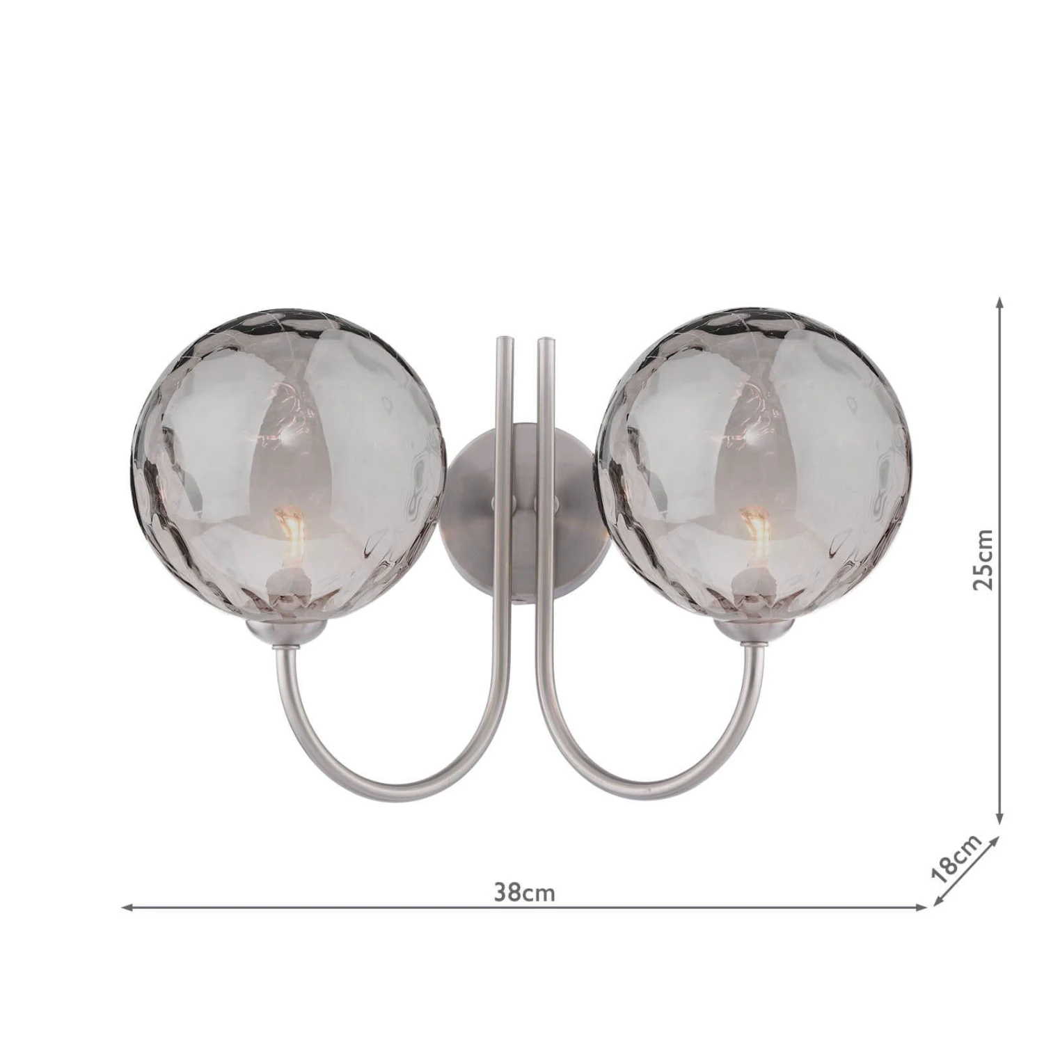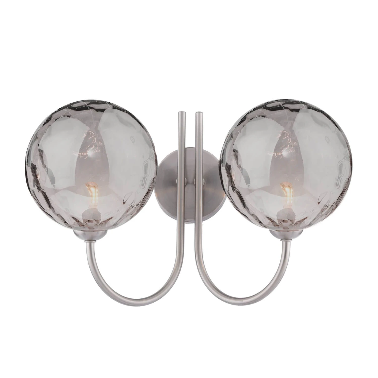 The Jared 2 Light Wall Light is a beautiful wall light featuring an oversized smoked dimple glass shade. The simple satin nickel frame and pull cord switch complements the glass perfectly. The Jared wall light features a pull cord switch for on/off operation and is suitable for an entryway, dining room or anywhere a little light and alot of style is needed. A matching ceiling light is also available.