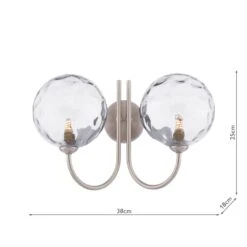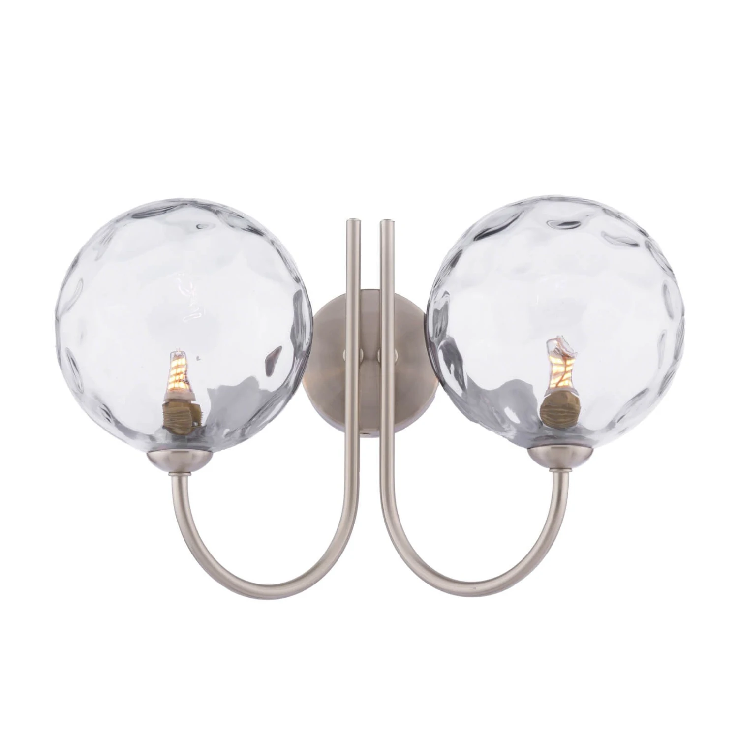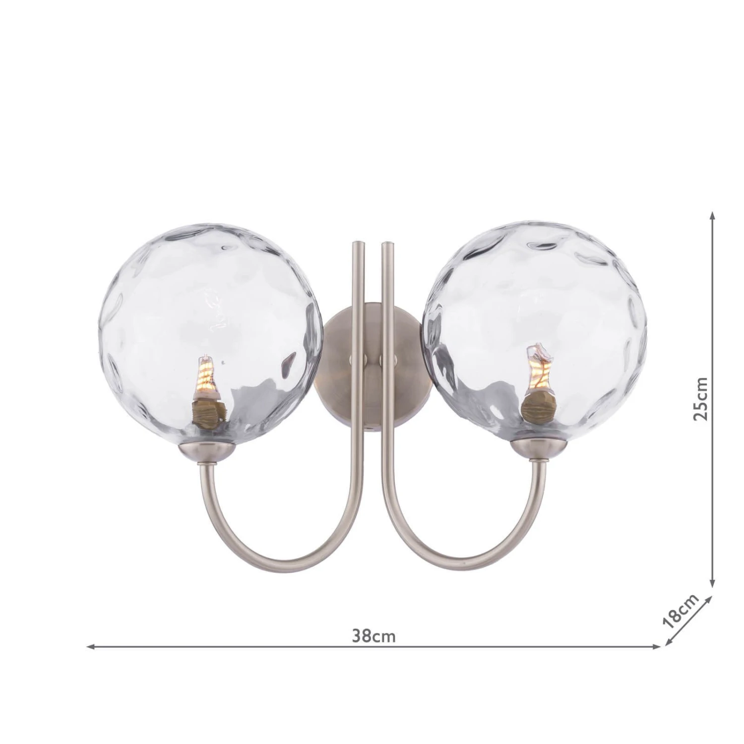 The Jared 2 Light Wall Light Satin Nickel & Dimpled Clear Glass is a beautiful wall light featuring an oversized dimpled glass shade. The simple satin nickel frame suits most rooms and allowing the glass to really shine. The Jared wall light features a pull cord switch making it perfect for use as a reading light or bedside lamp. A matching ceiling light is also available.