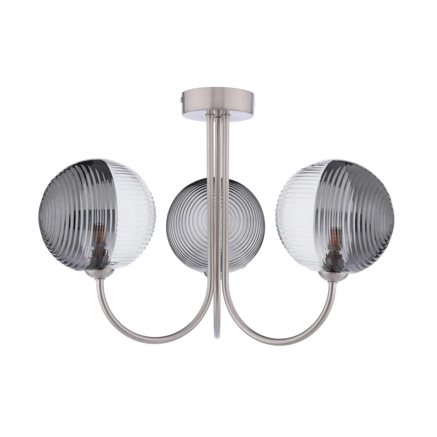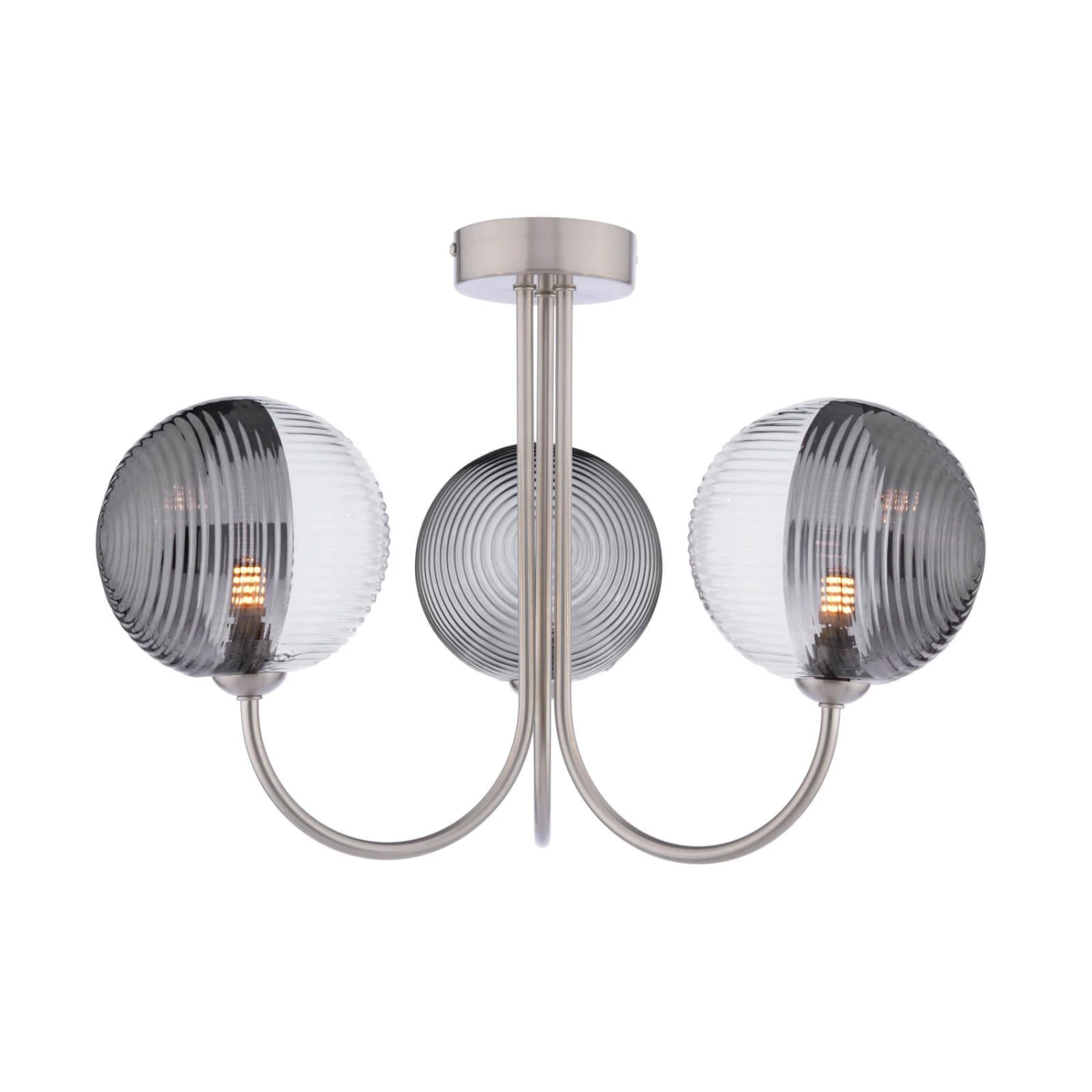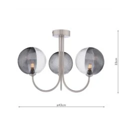 The Jared 3 Light Semi-Flush Satin Nickel & Smoked Glass is a beautiful semi-flush fitting with unique oversized asymmetric glass shades which are half smoked and half clear with opposing radial and linear ribbing. The simple satin nickel frame suits low ceiling rooms and allows the glass to really shine. The Jared semi-flush is suitable for an entryway, dining room or anywhere a little style is needed.