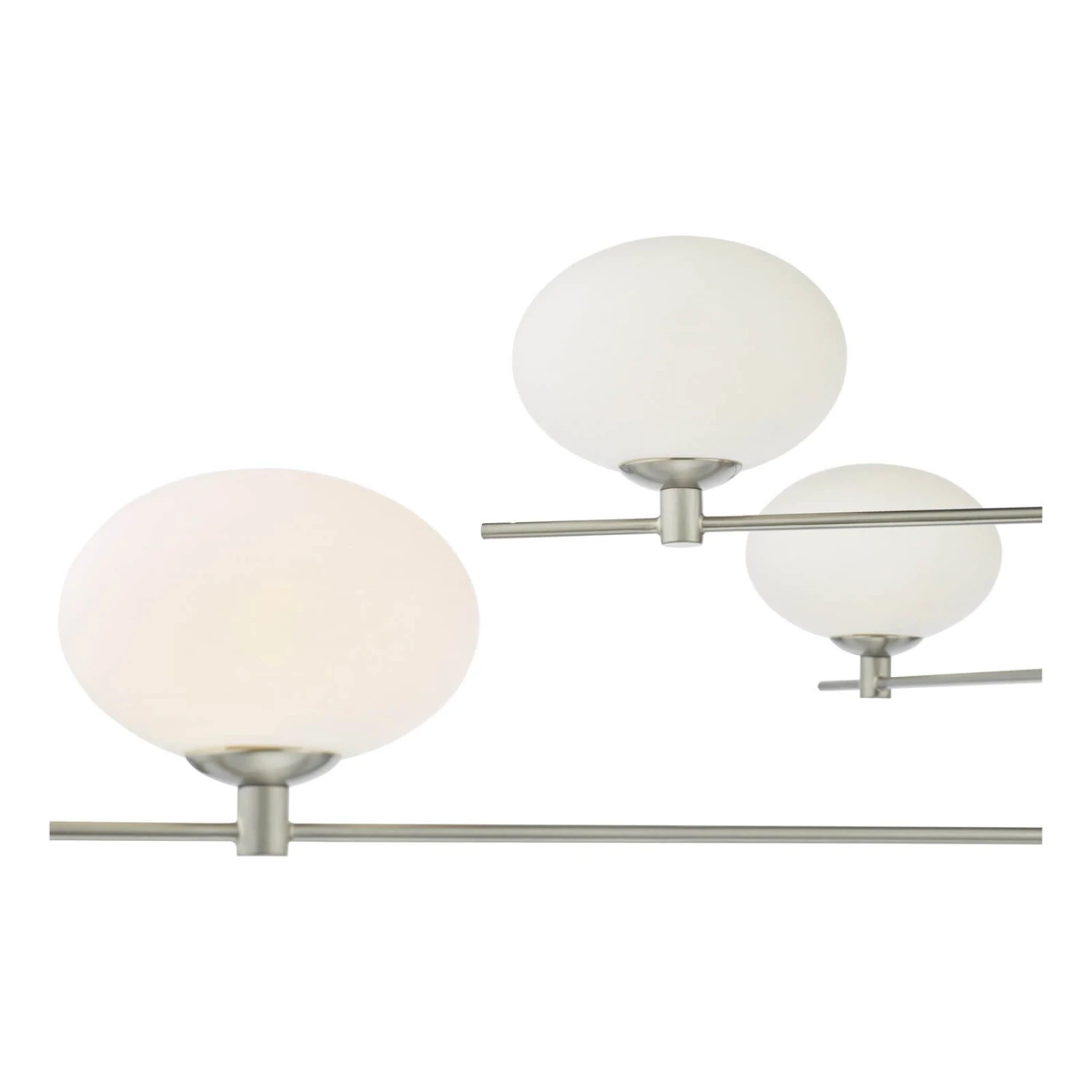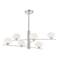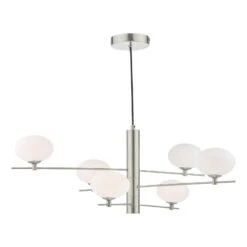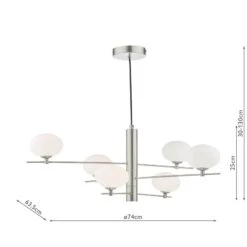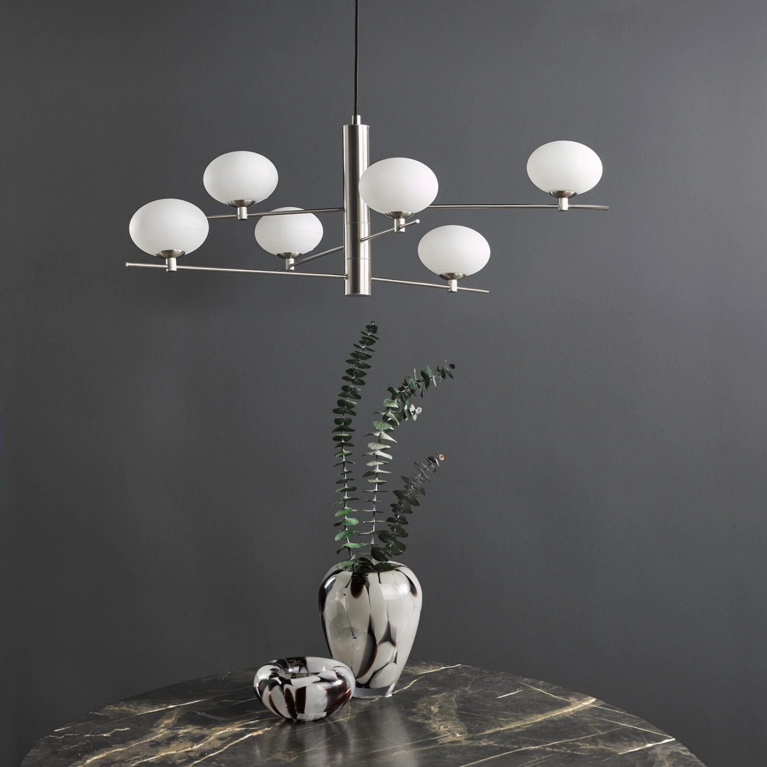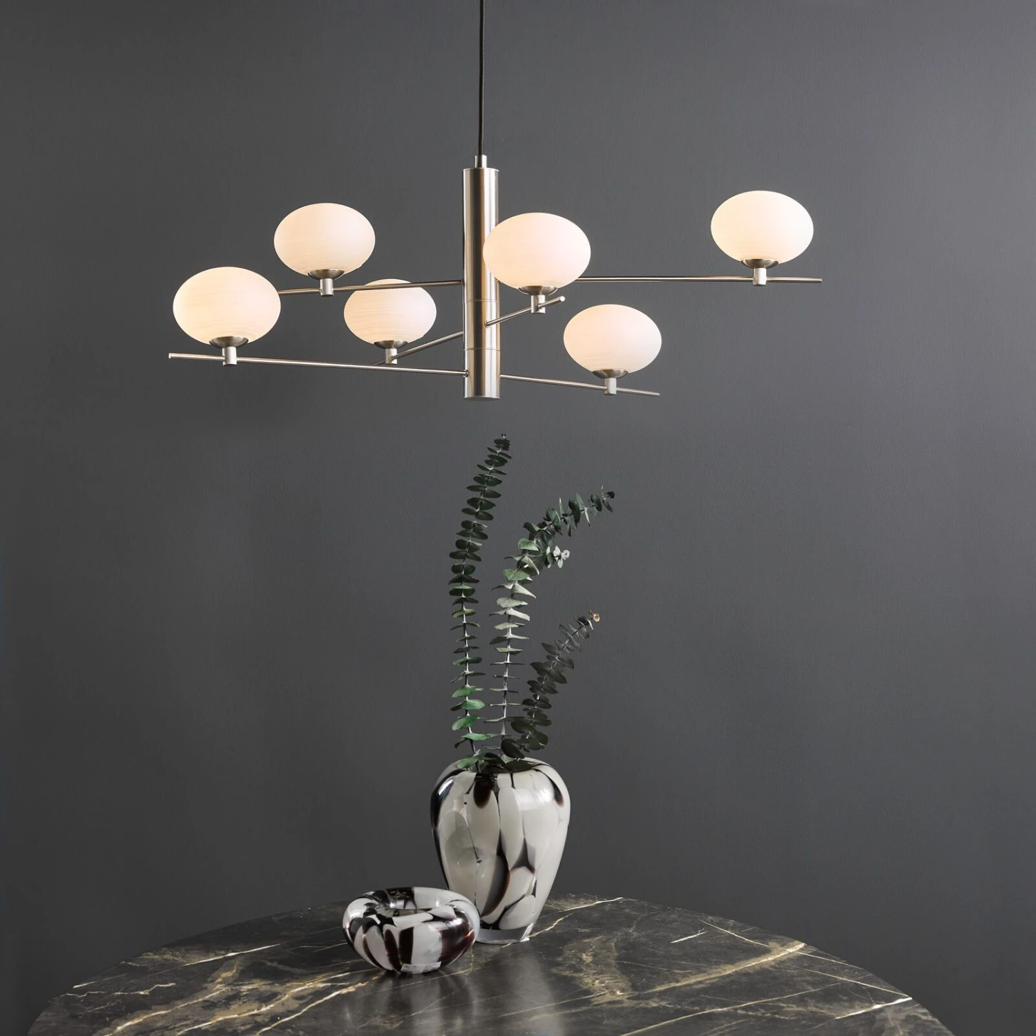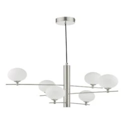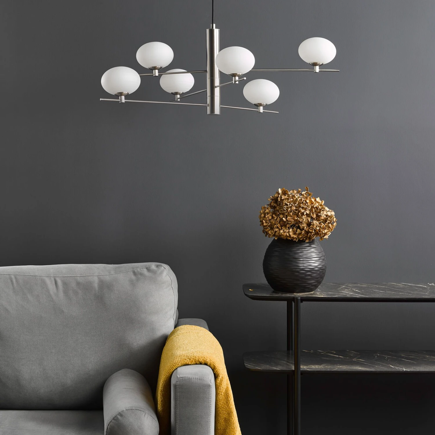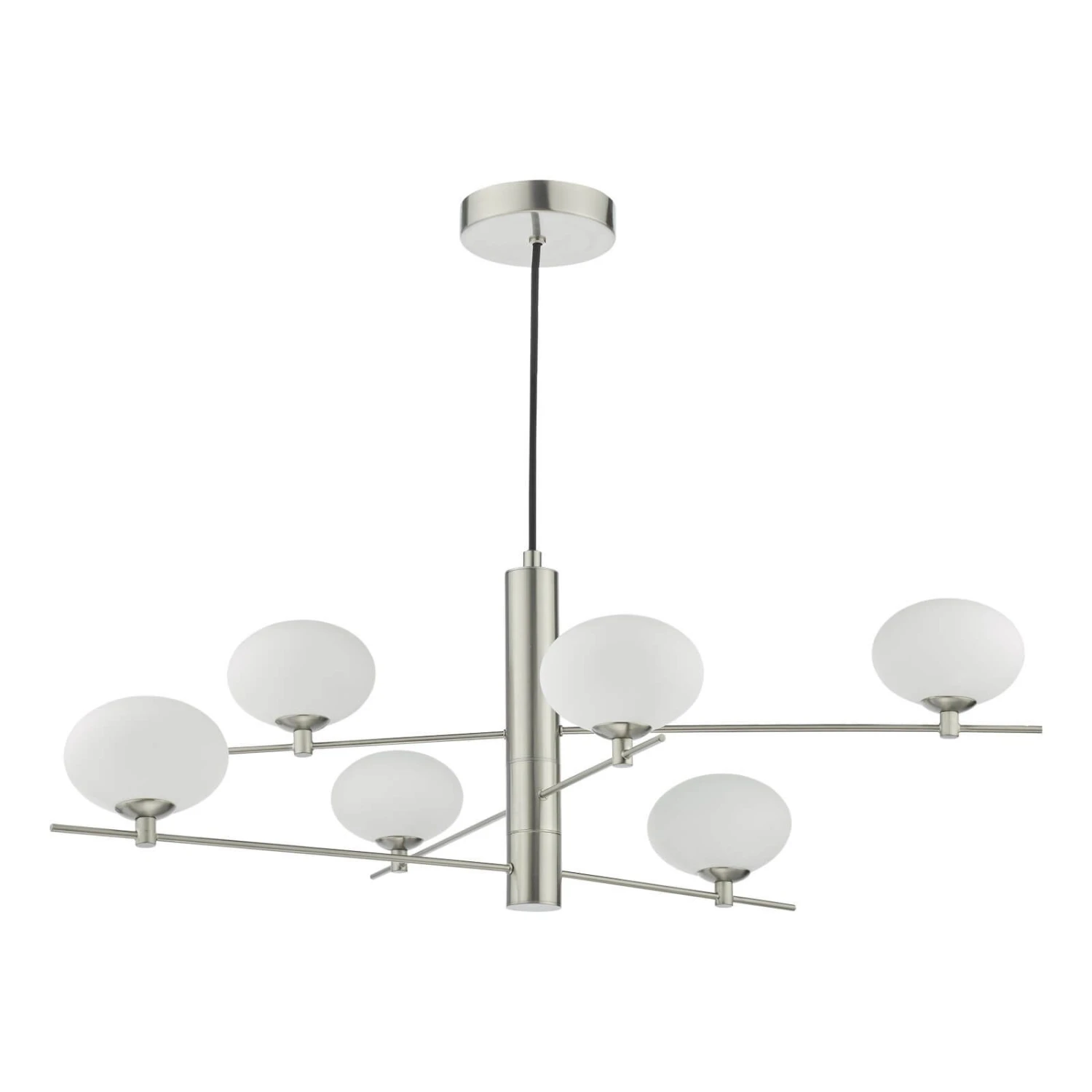 The Jasper 6 Light Pendant Satin Nickel and Opal Glass is a mid-century inspired contemporary pendant light with fine arms holding a swirl of opal glass. The Jasper pendant light features a black braided cable and is height adjustable on installation. The Jasper pendant light takes 6 G9 bulbs (not supplied), We recommend using LED filament lamps from our range of LED bulbs