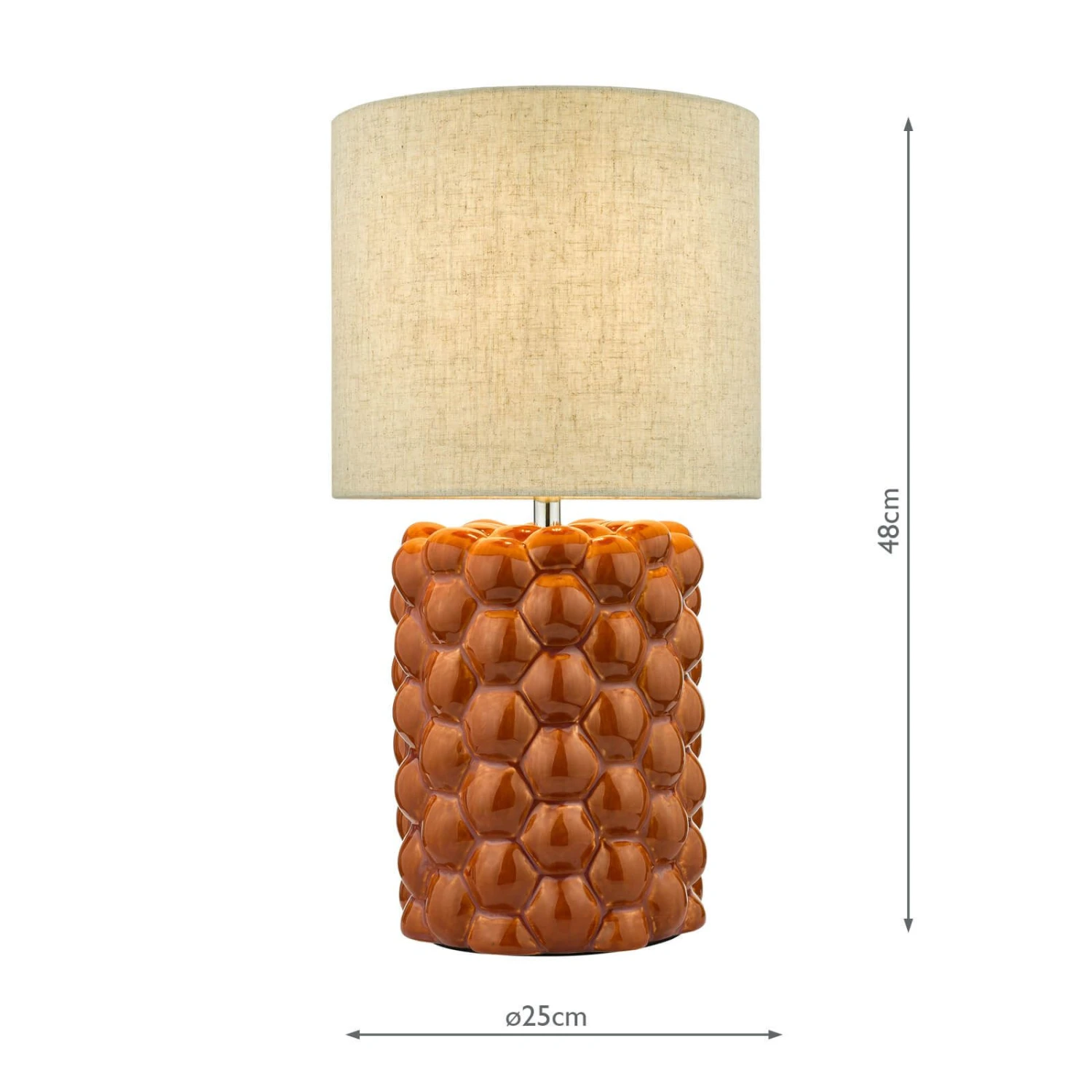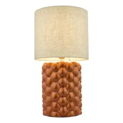 The Jayden ceramic table lamp is a retro-inspired cylindrical table lamp with a bobble surface finish and a burnt umber glaze. Finished with a natural linen shade.