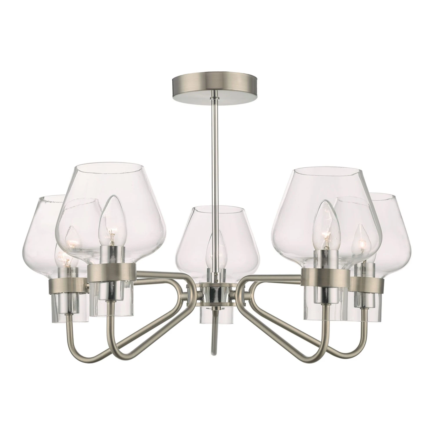 The Keta 5 light Pendant KET5446 is a semi flush ceiling light featuring glass shades with a retro look resting on a complementing satin chrome frame and glass. The KET0746 is part of our Keta range which also features a similarly styled wall light.