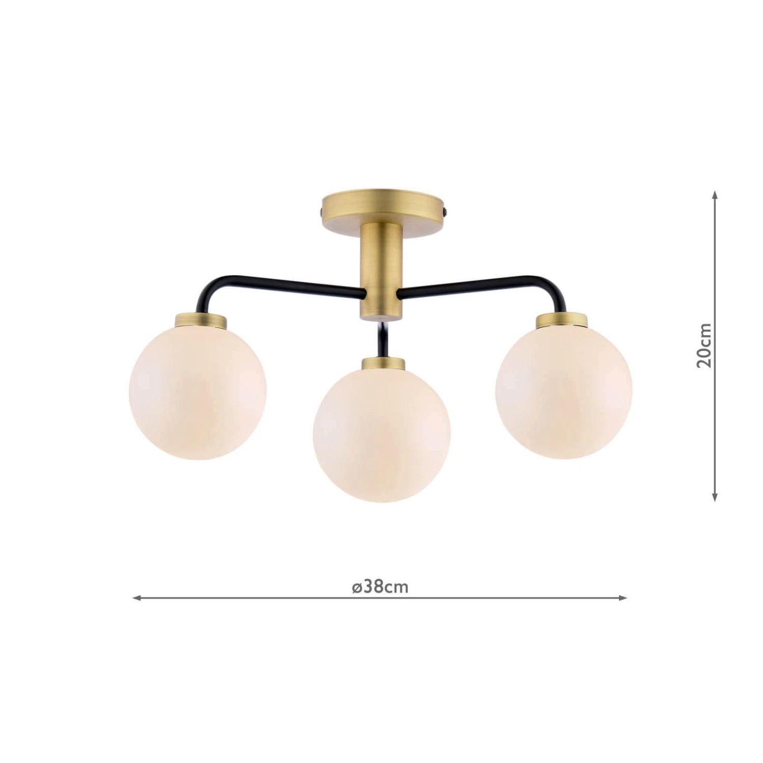 The Lainey 3 Light Semi-Flush Matt Black & Opal Glass is a simple matt black semi-flush fitting with antique brass accents. The simple matt black frame is paired with simple opal glass shades. The Lainey semi-flush is suitable for an entryway, dining room or anywhere a little style is needed.