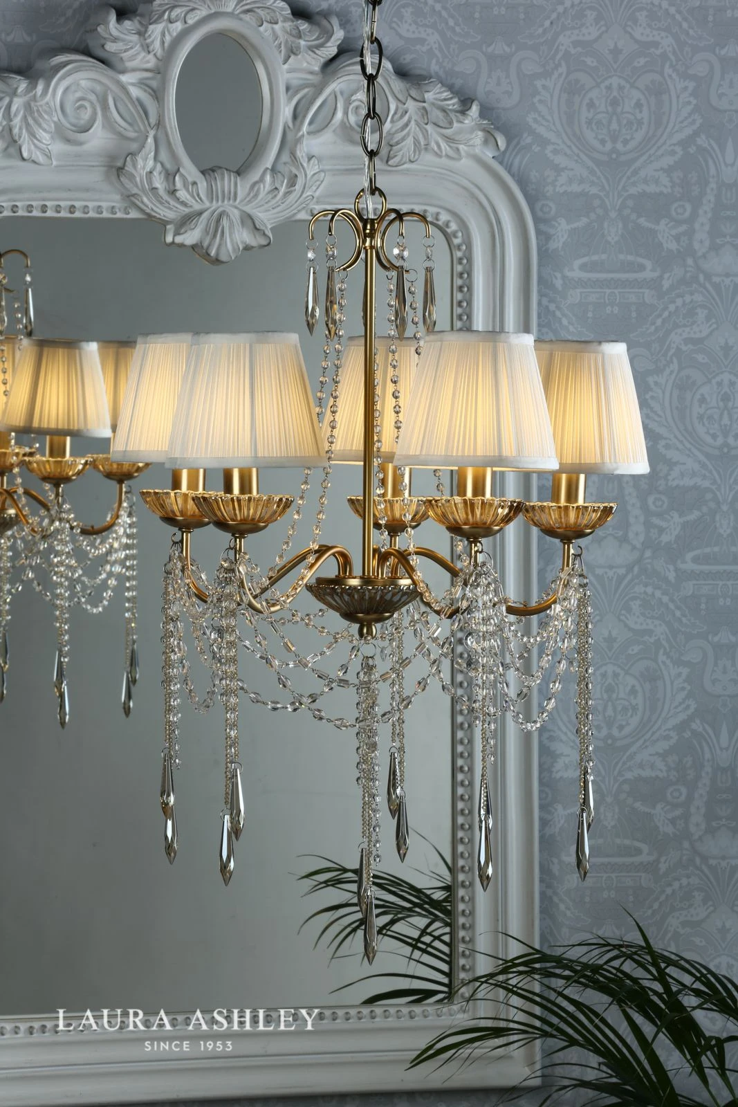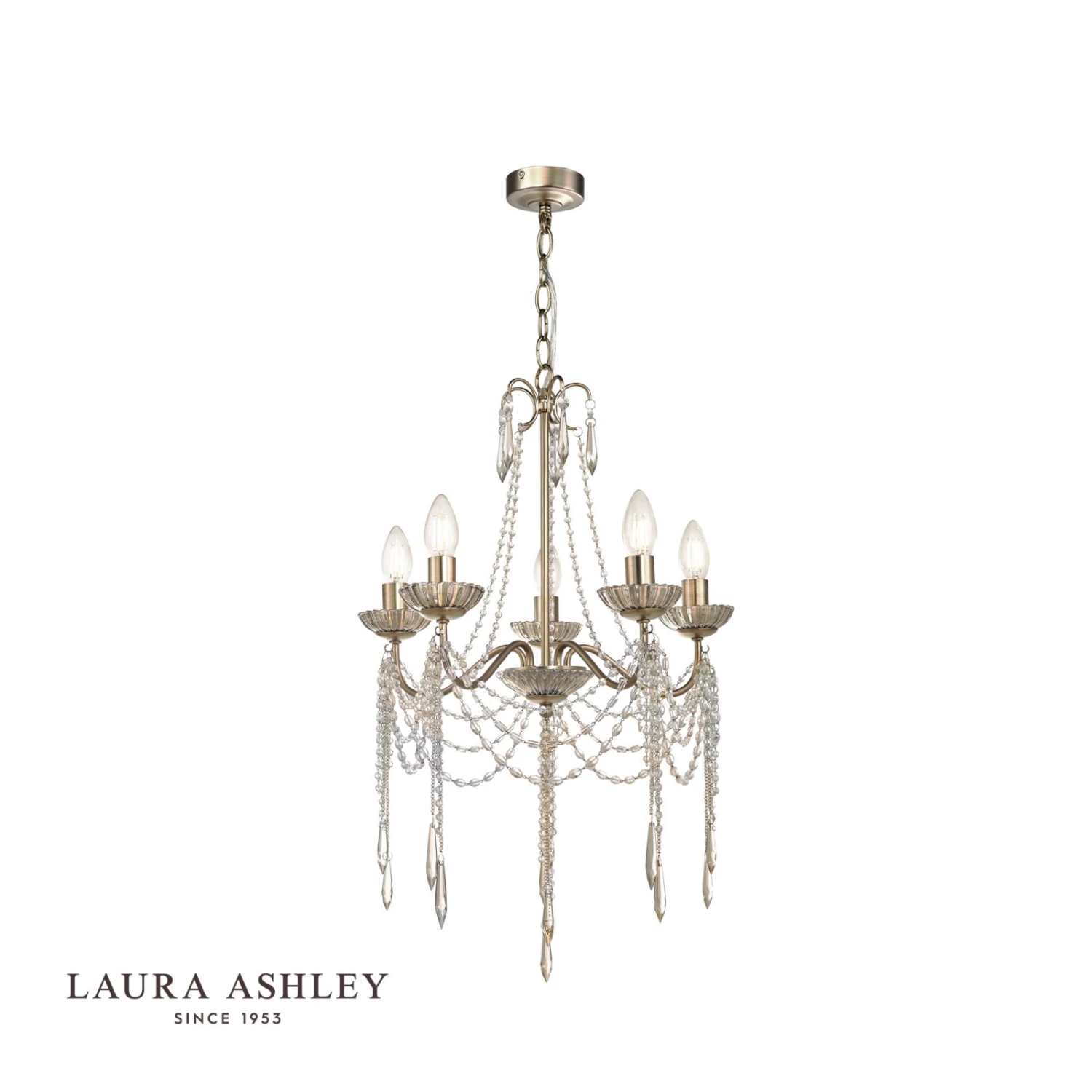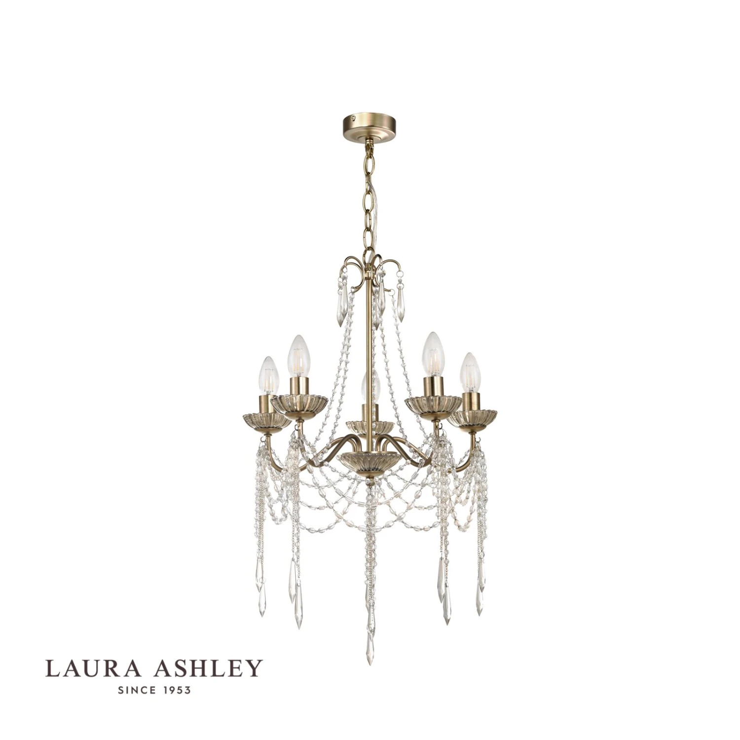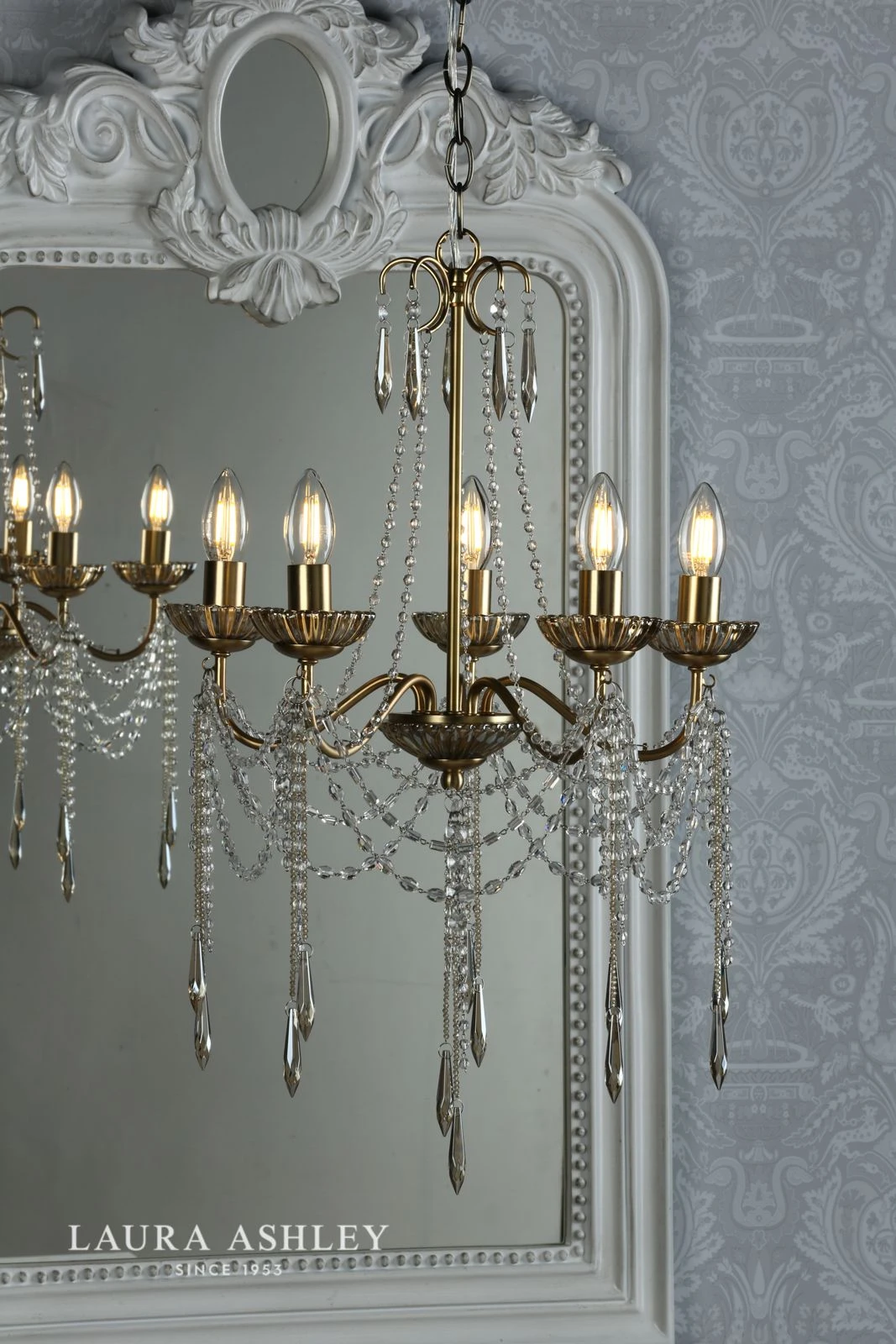 Everything a chandelier should be, the Aisling from Laura Ashley sparkles with French glamour and femininity, like a piece of jewellery for your home. Finished by hand, it is simply dripping – in true French chateau style – with hand-cut faceted drops and swags of crystal beads of varying shapes. These crystals are suspended from a warm antique brass finish frame.