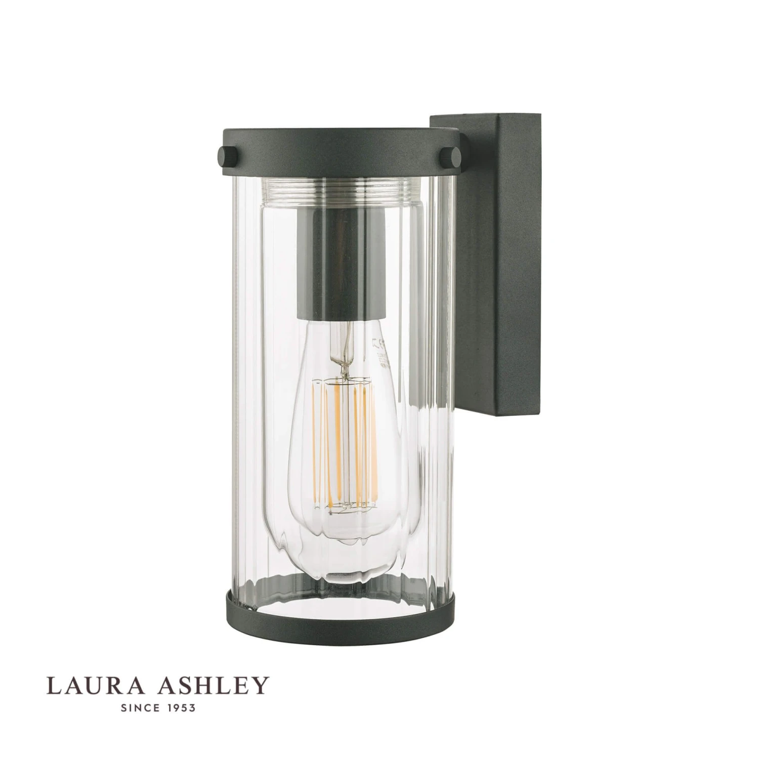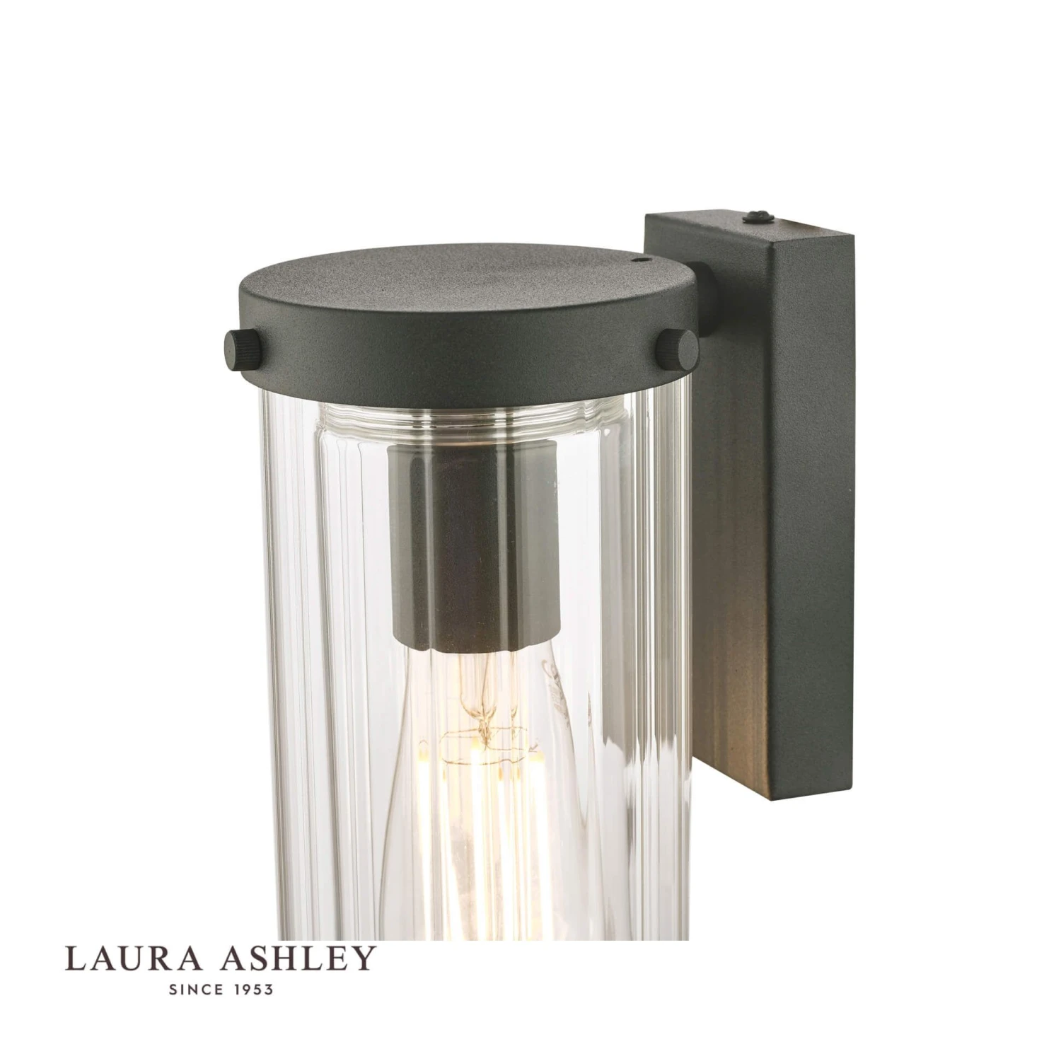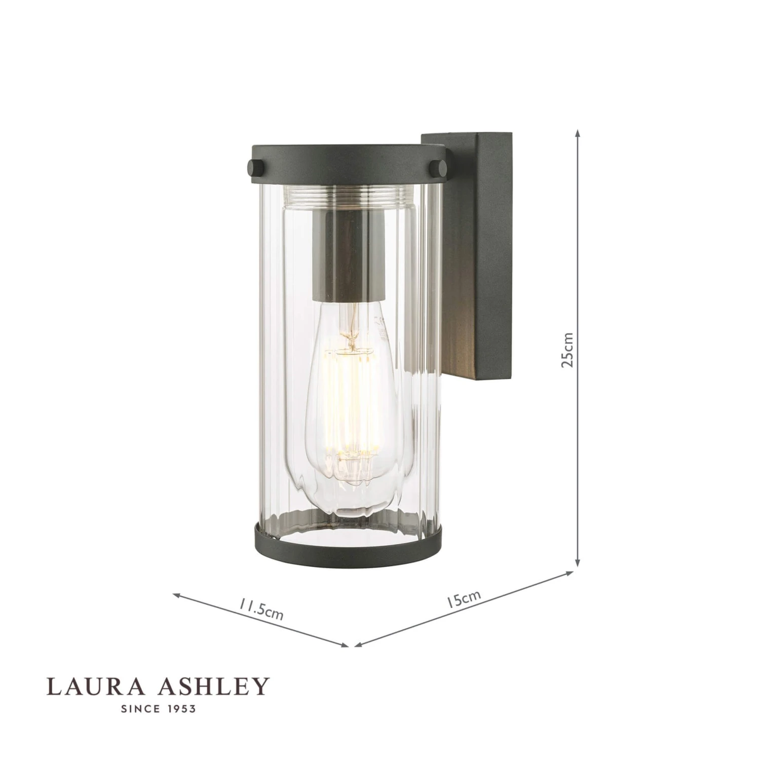 The Arthur wall light from iconic brand Laura Ashley is an elegantly proportioned contemporary wall light, perfect for lighting a patio or placing beside a doorway. This large, cylindrical outdoor light is fitted with clear glass, gently ribbed on the inside, which creates striking highlights when lit. Mounted on a rectangular wall plate, it is finished in matt powder-coated black. The light bulb in enclosed in a dome-ended tube, to protect it from the weather. IP44 rated for safe outdoor use. Bulb not included; takes 1 x 40W max GLS light bulb.